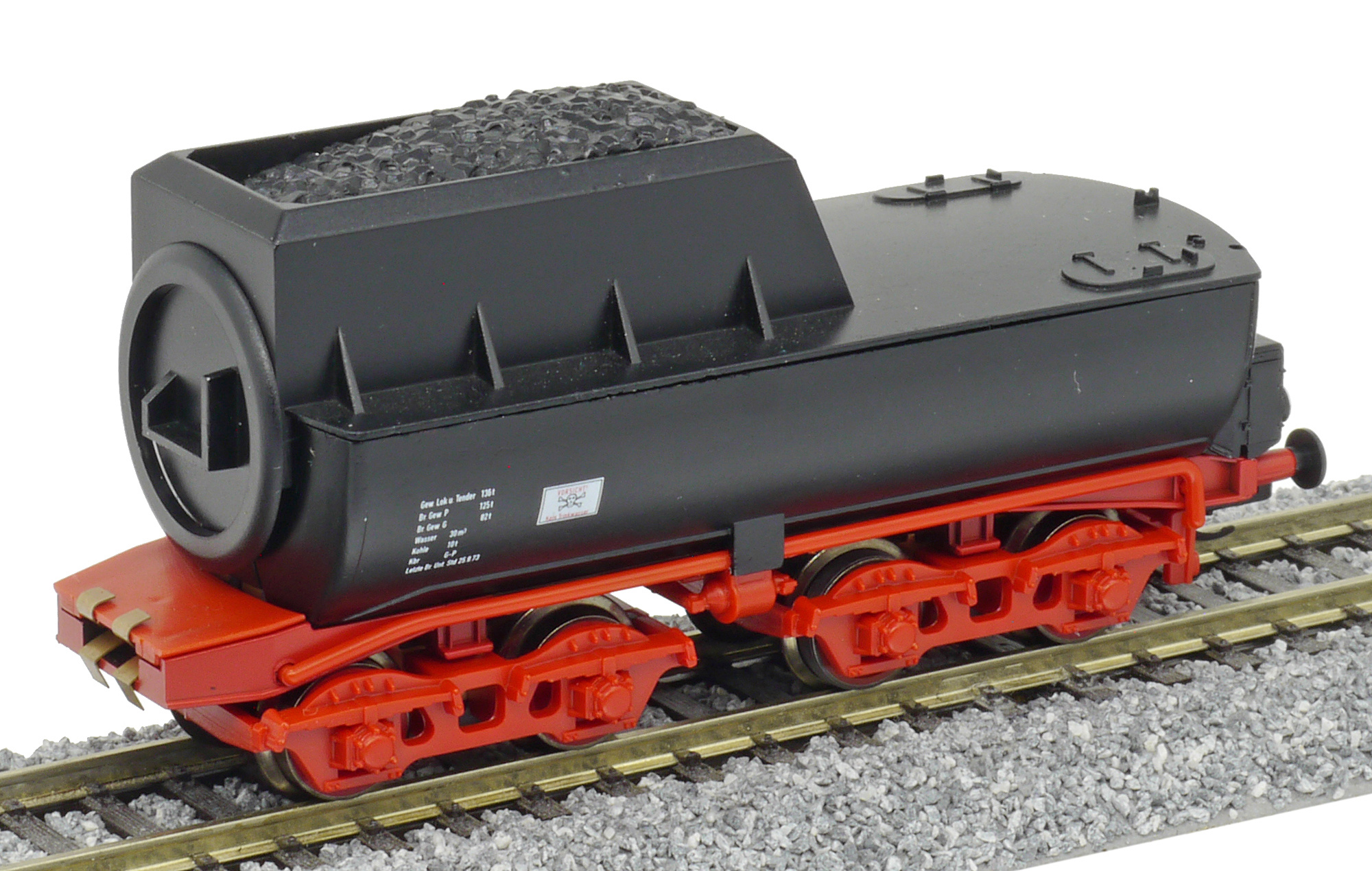 Popis   parní lokomotiva černá s kouřovými plechy, červený pojezd, vanový tendr