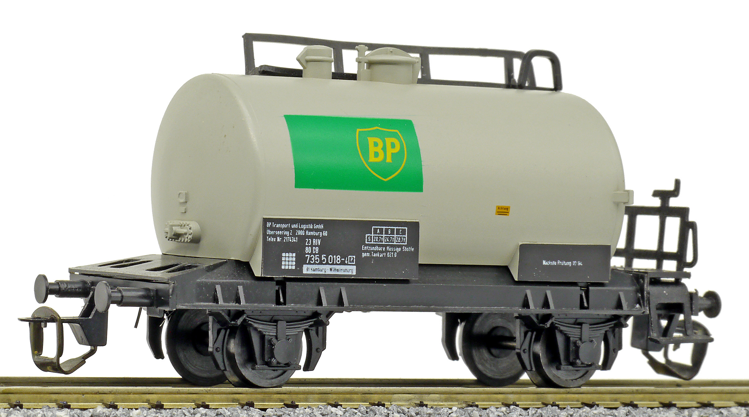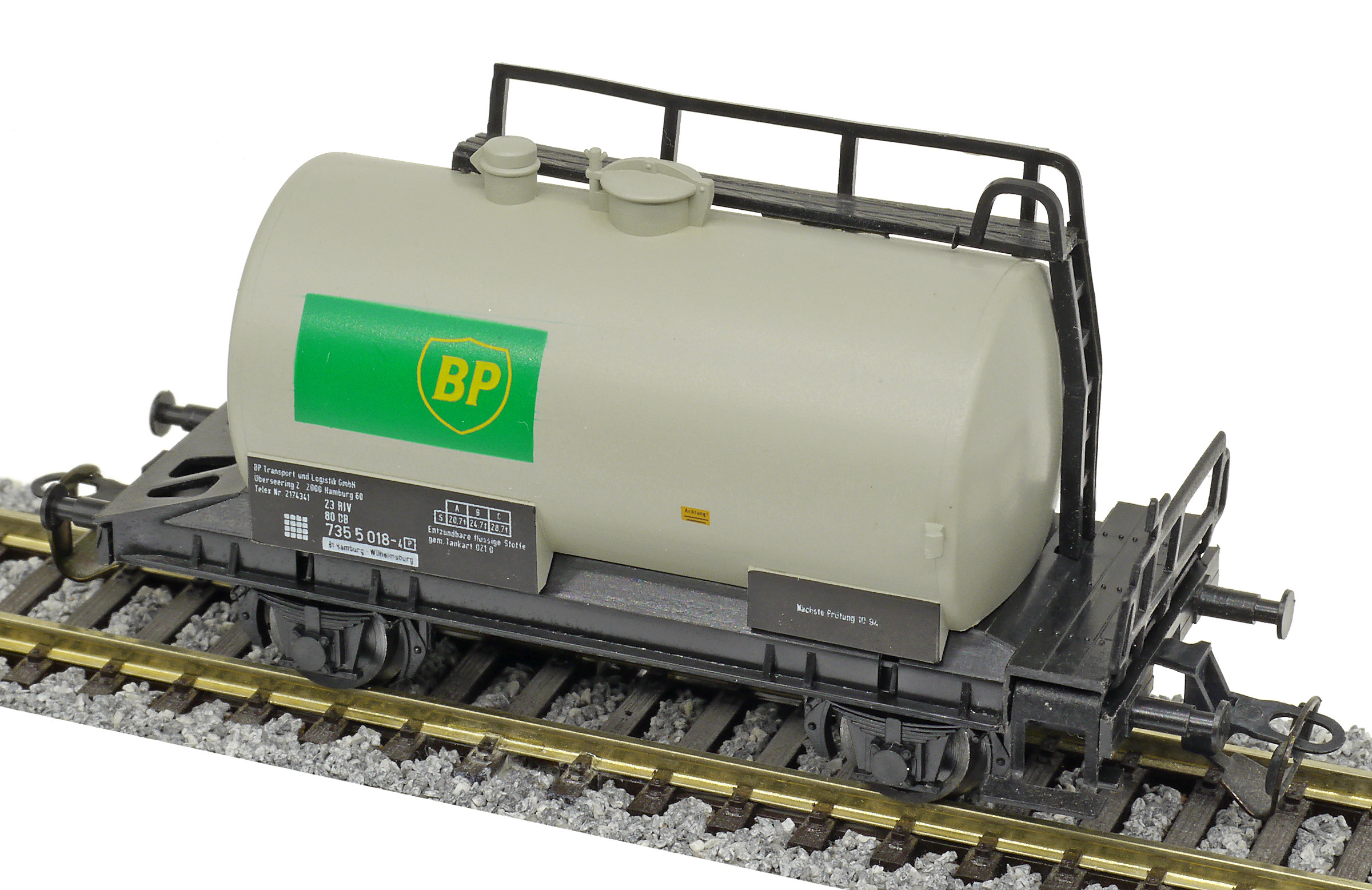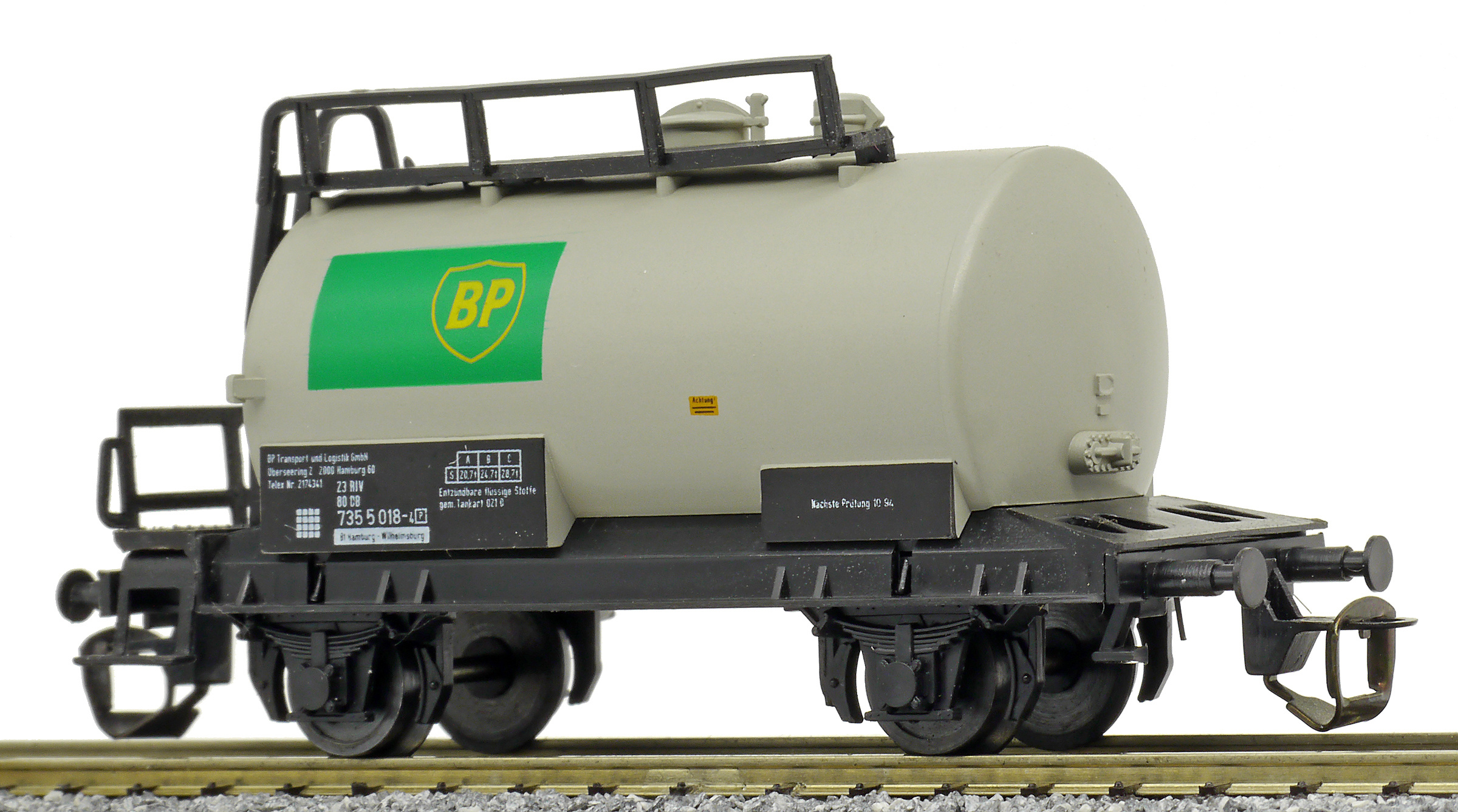 cisternový vůz světle šedý s černým rámem „BP“
