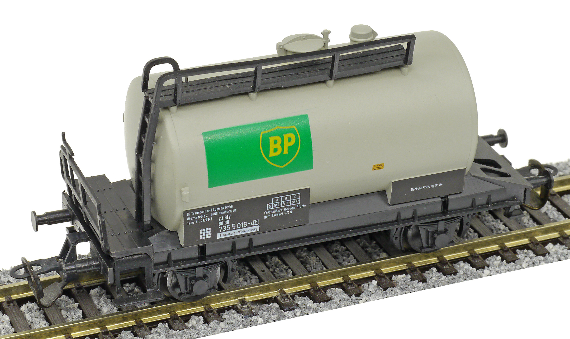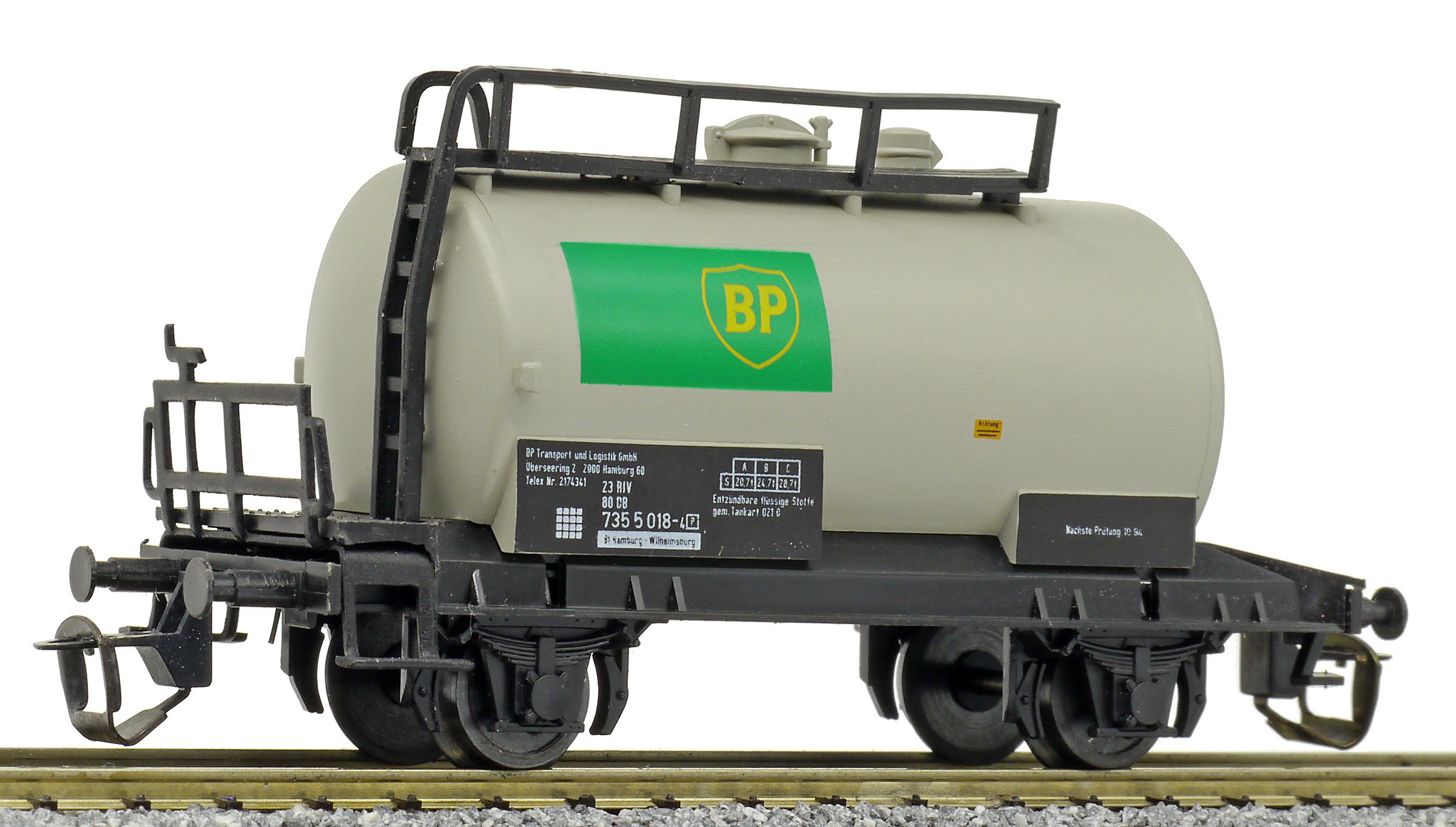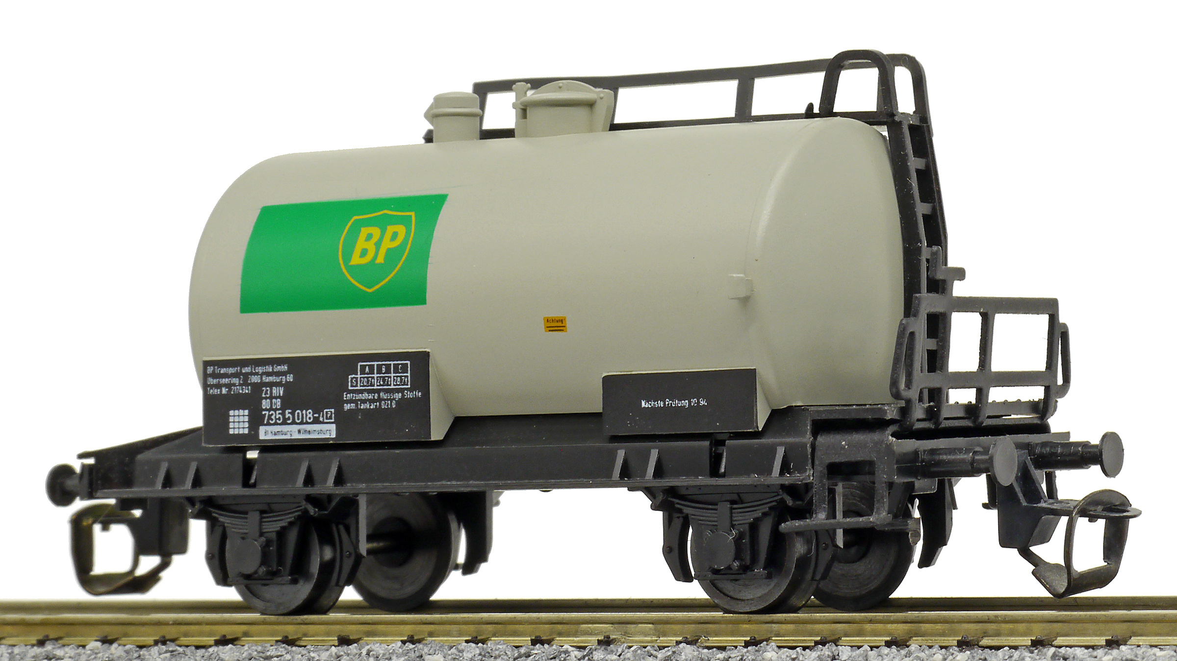 cisternový vůz světle šedý s černým rámem „BP“