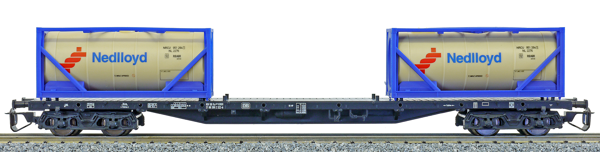 | nákladní plošinový vůz černý se dvěma cisternovými kontejnery „Nedlloyd“ |