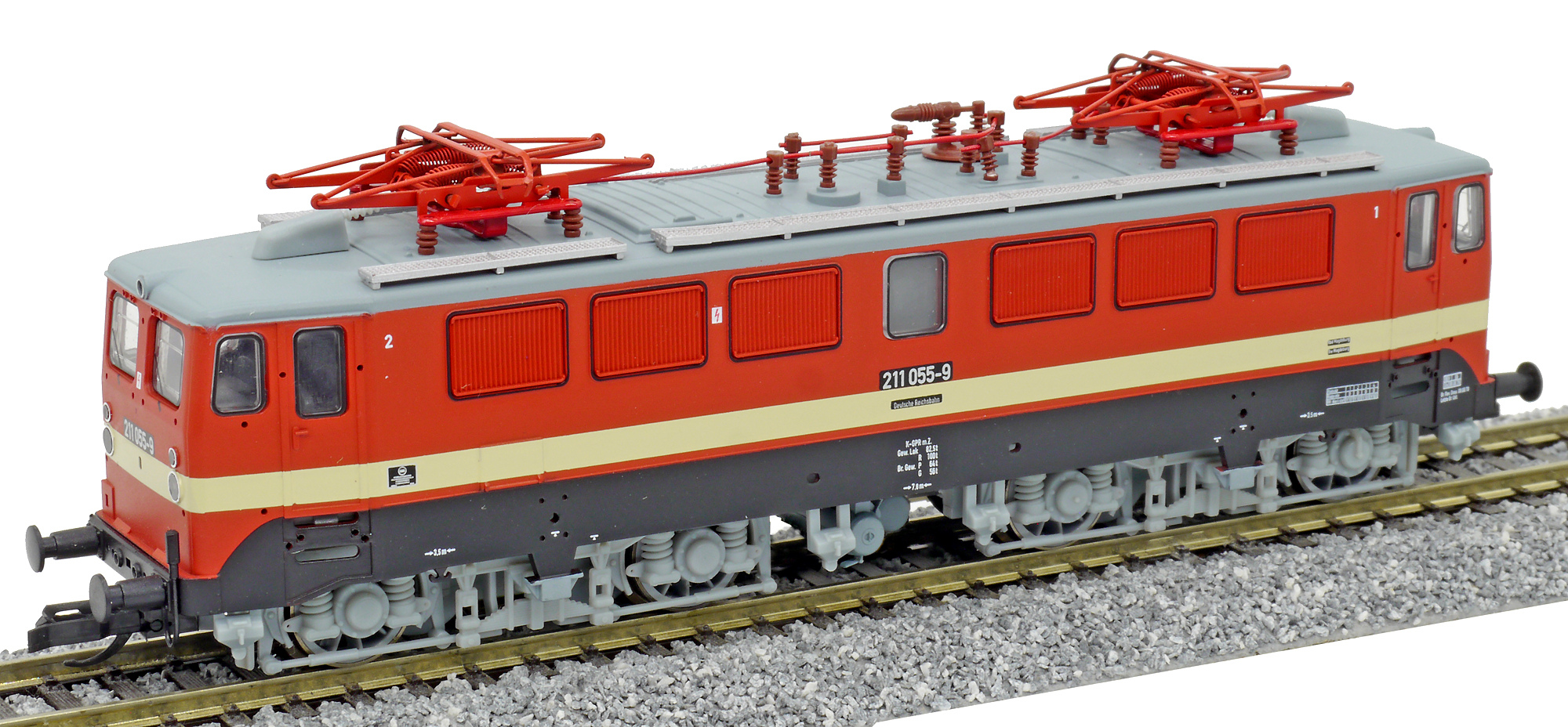 Popis   elektrická lokomotiva červená s krémovým pruhem, šedé podvozky
