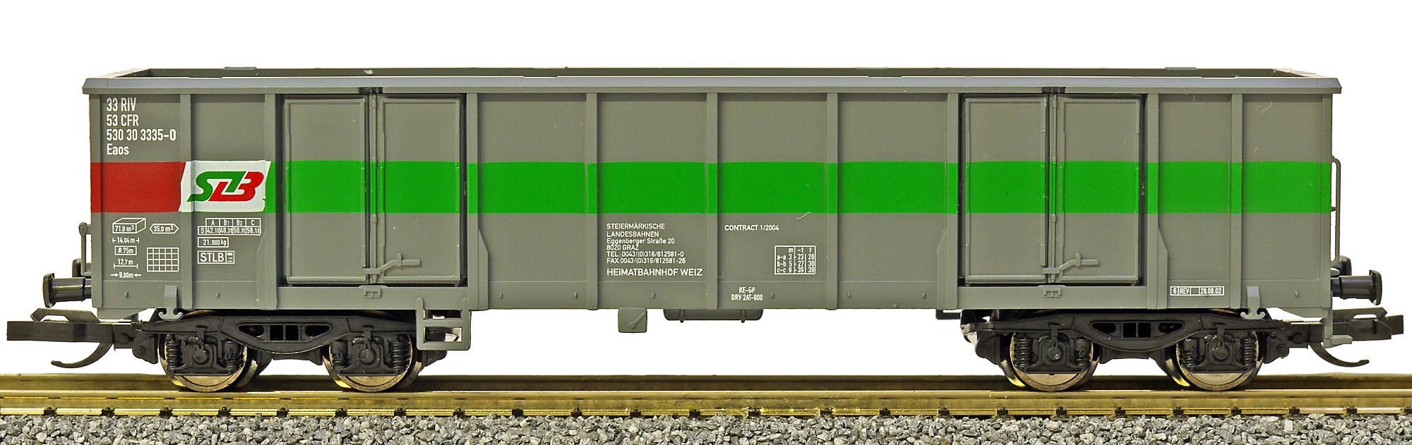 Popis   vysokostěnný nákladní vůz tmavě šedý se zeleným pásem
