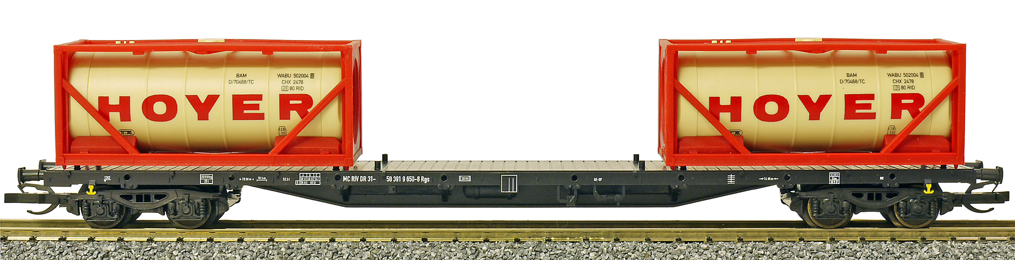 | nákladní plošinový vůz černý se dvěma cisternovými kontejnery 20' „HOYER“ |