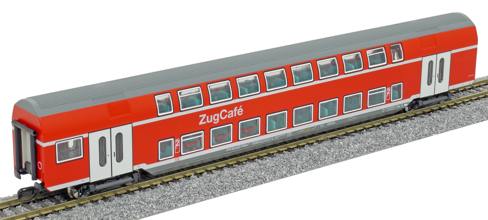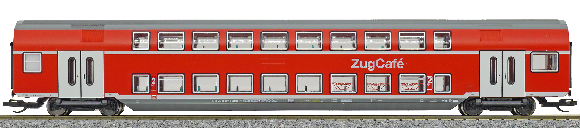 Popis   patrový vůz červený s bílými proužky a dveřmi a s šedou střechou 2. tř. „Zug Café“