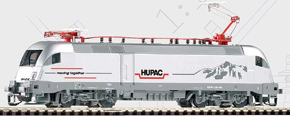 Popis   elektrická lokomotiva stříbrná s šedým rámem „Hupac“