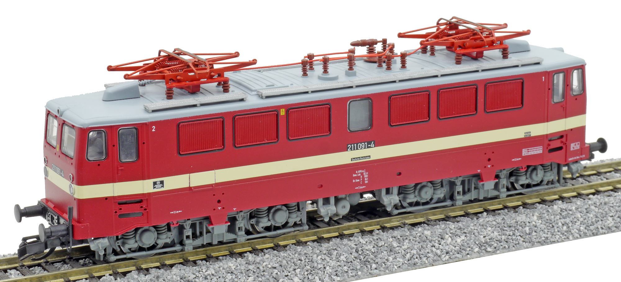 Popis   elektrická lokomotiva červená s krémovým pruhem a šedými podvozky