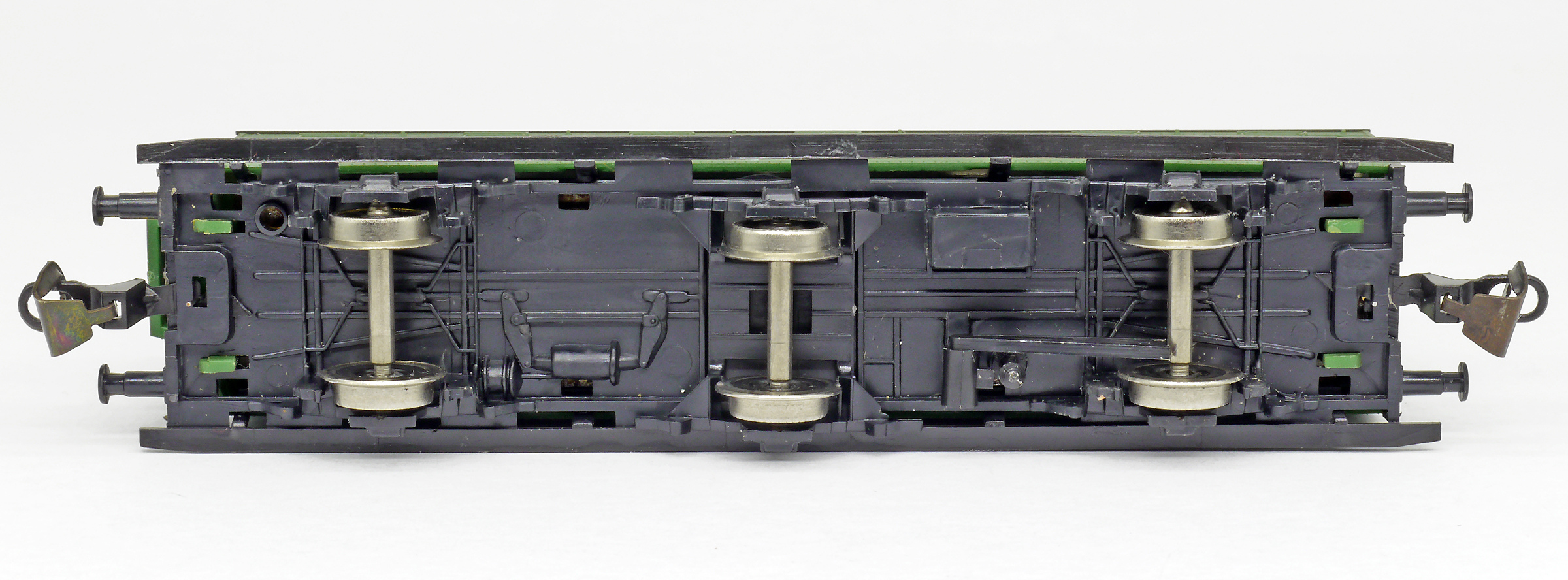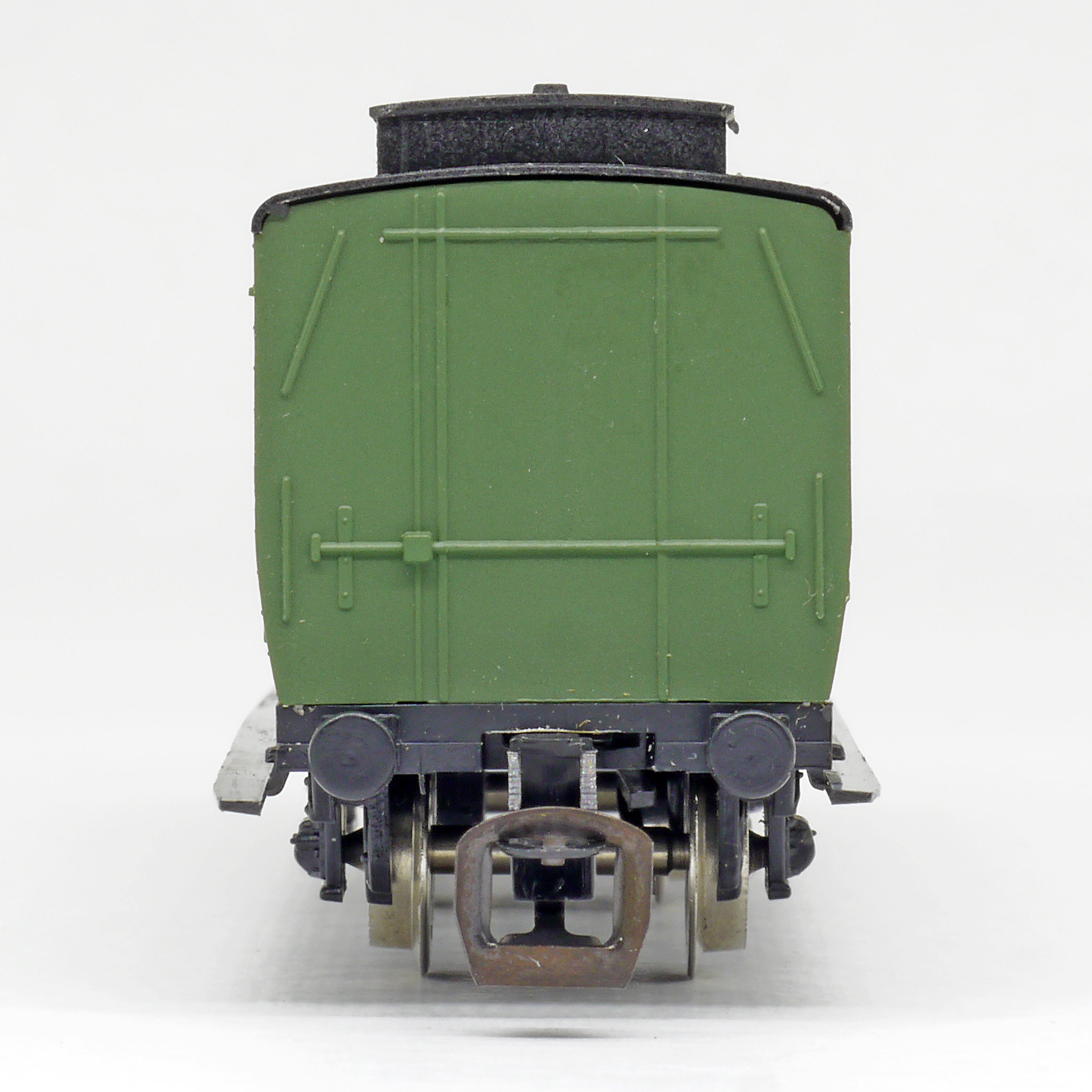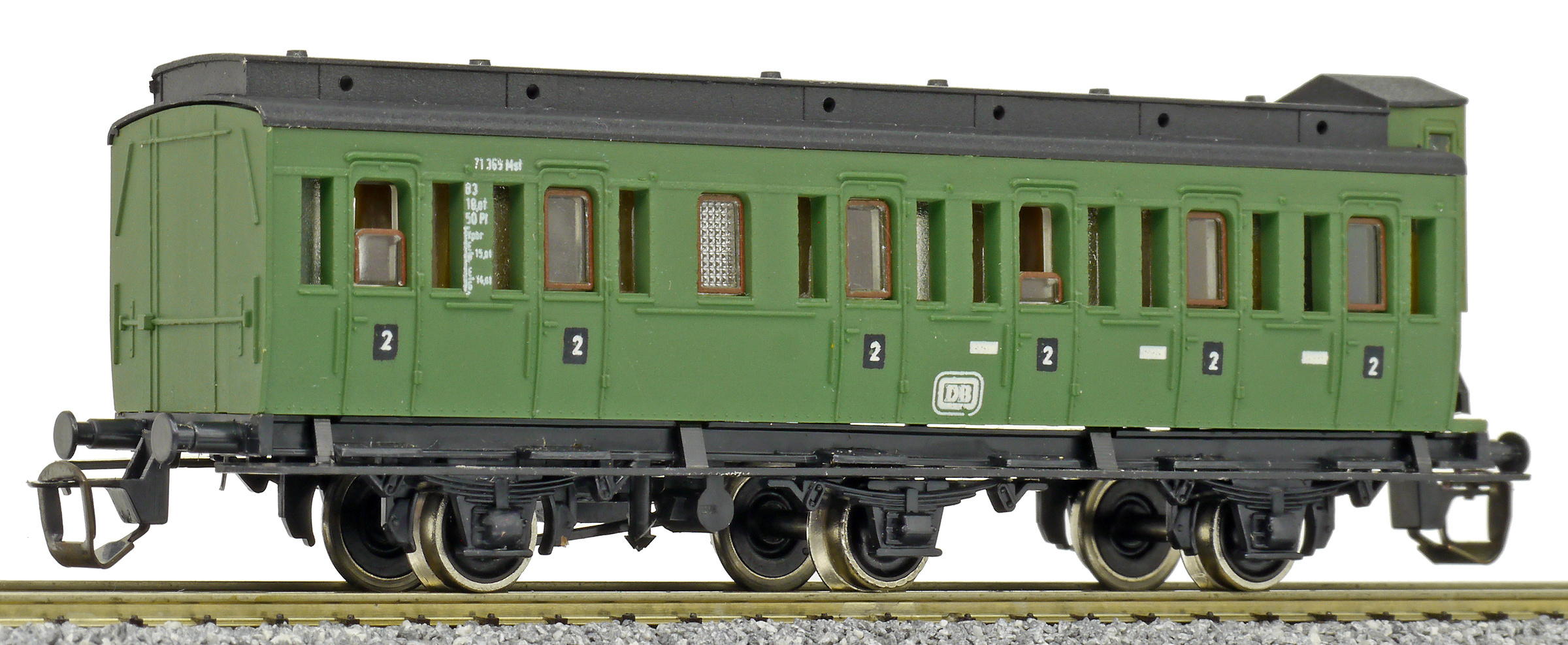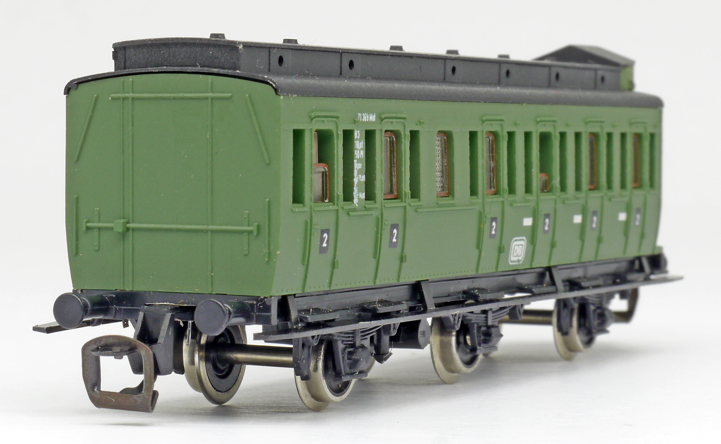 oddílový osobní vůz zelený s černou střechou a s brzdařskou budkou 2. tř.