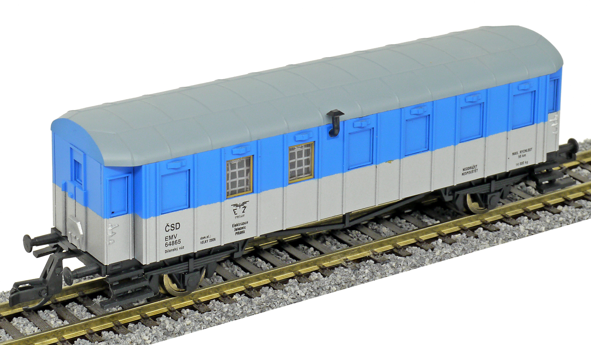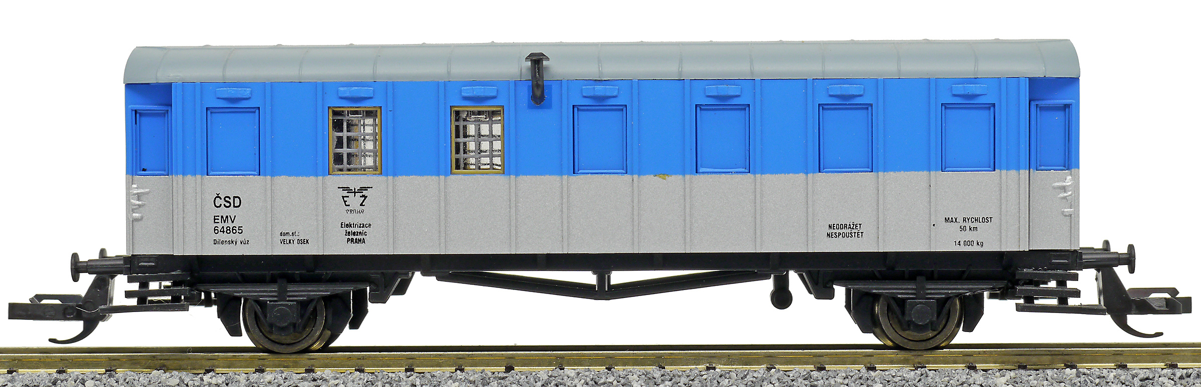 | dílenský vůz modrý-stříbrný s šedou střechou „Elektrizace železnic“ |