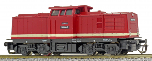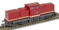 | dieselová lokomotiva červená s krémovým pruhem a černým pojezdem |