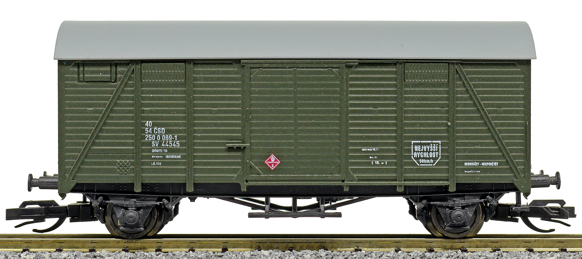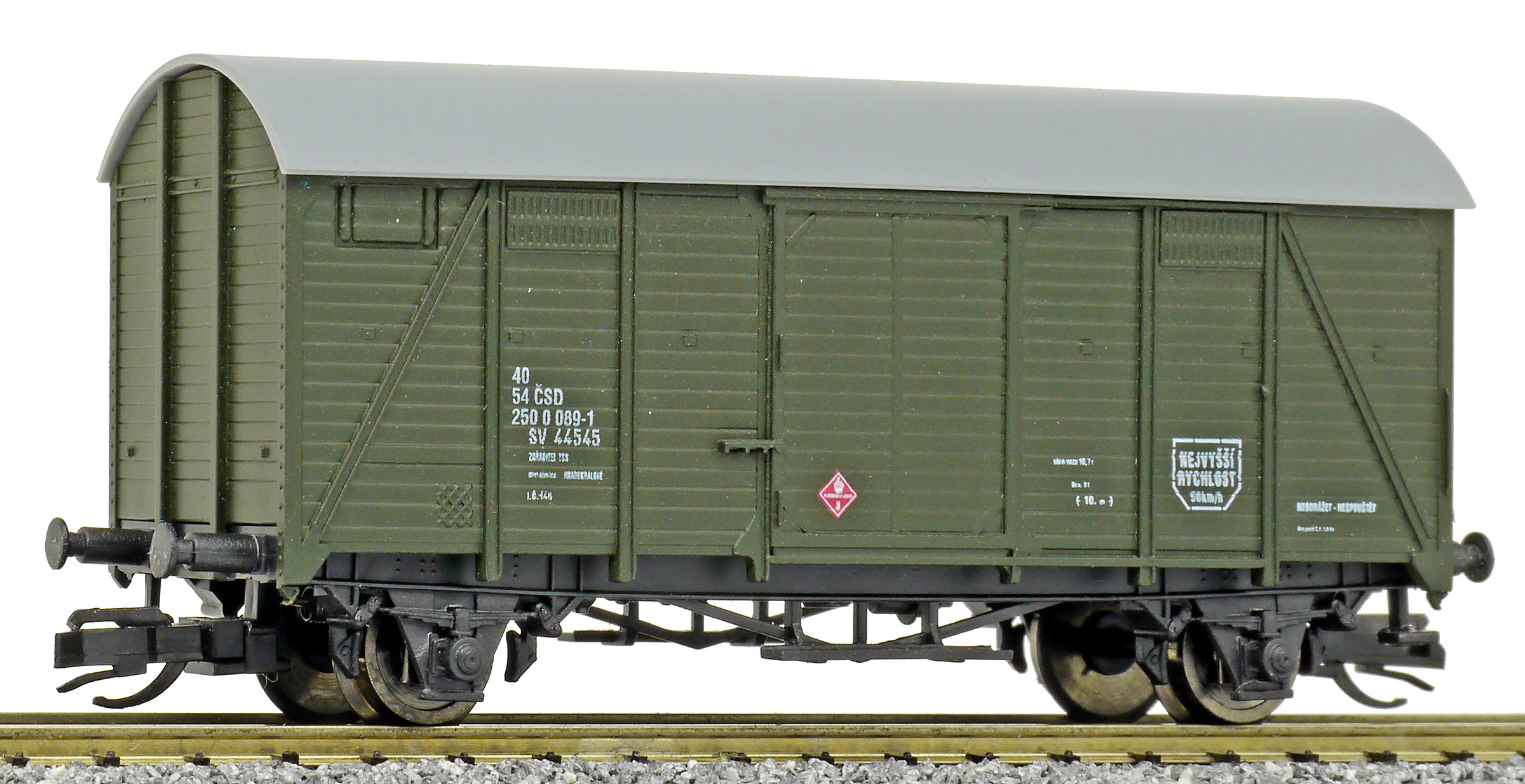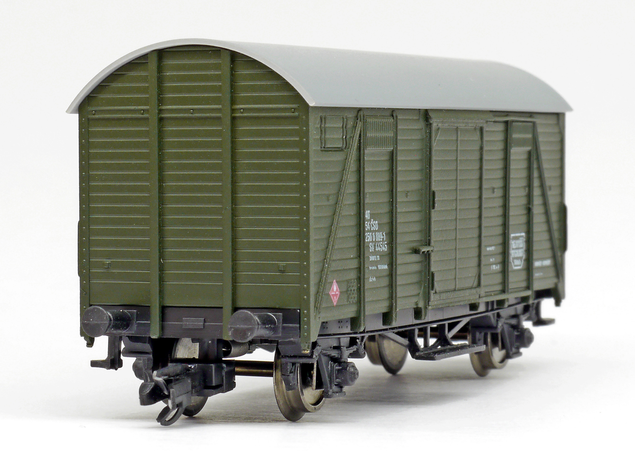 | krytý nákladní vůz zelený s šedou střechou do pracovního vlaku SV 44545 |