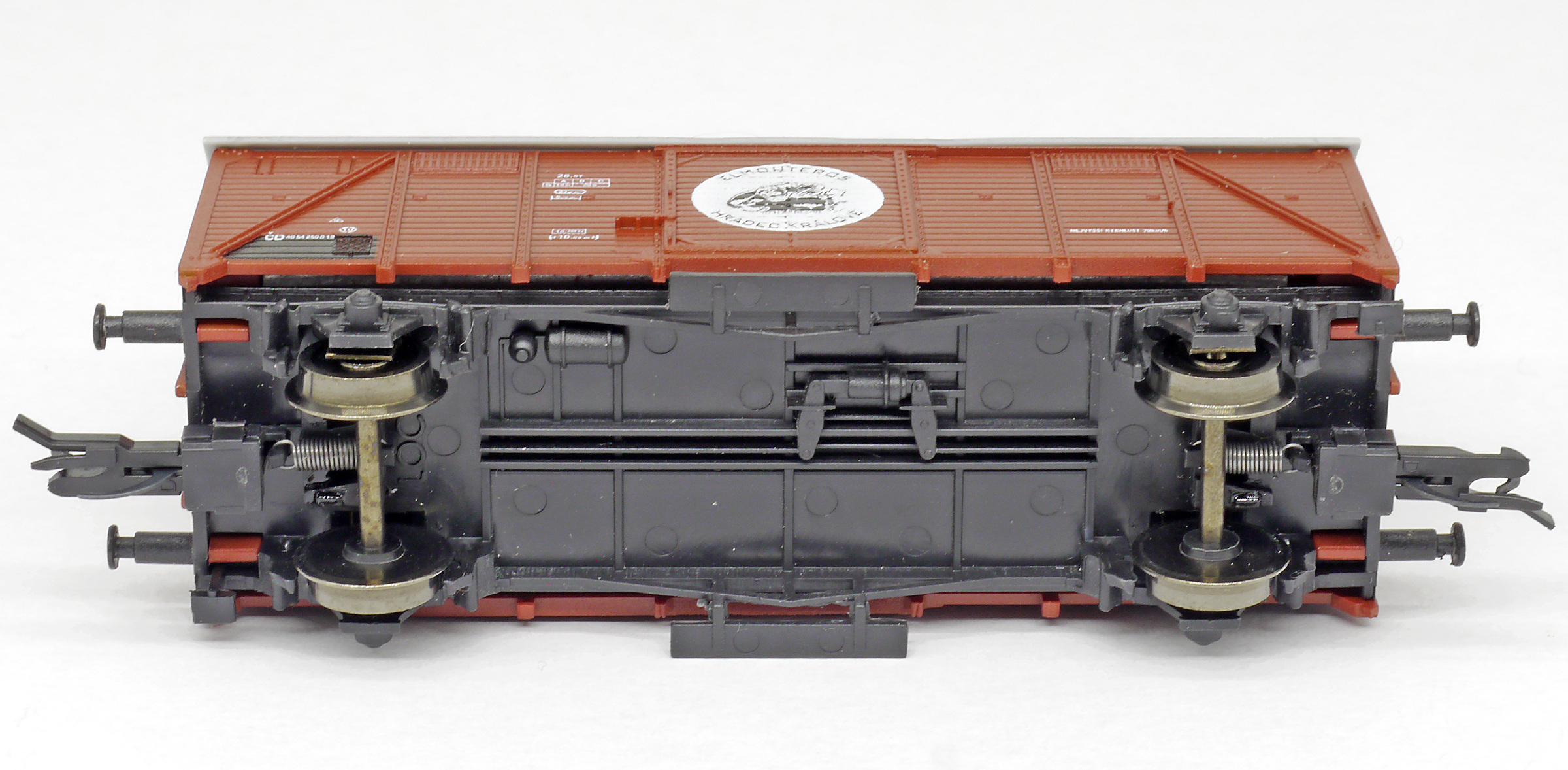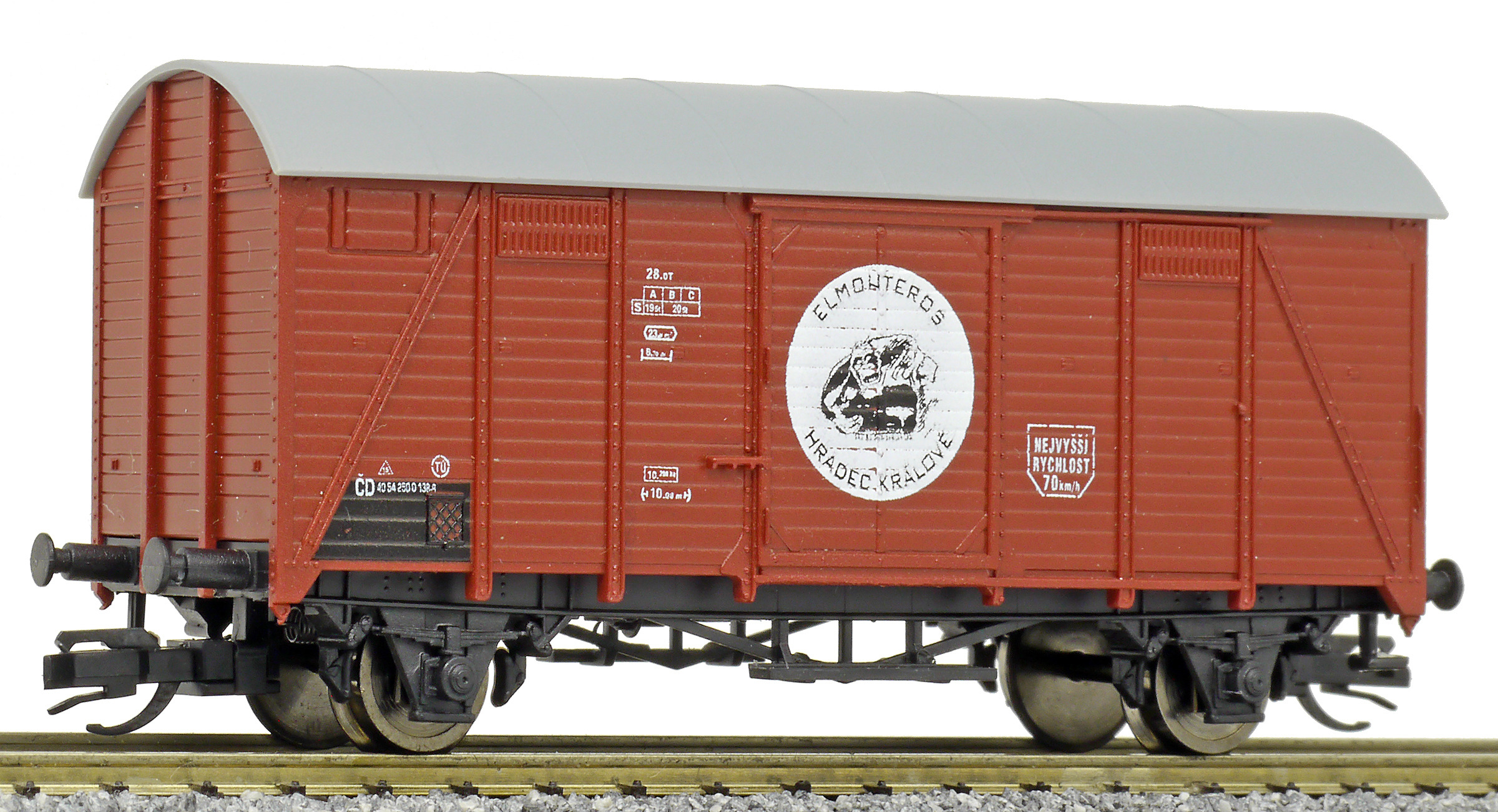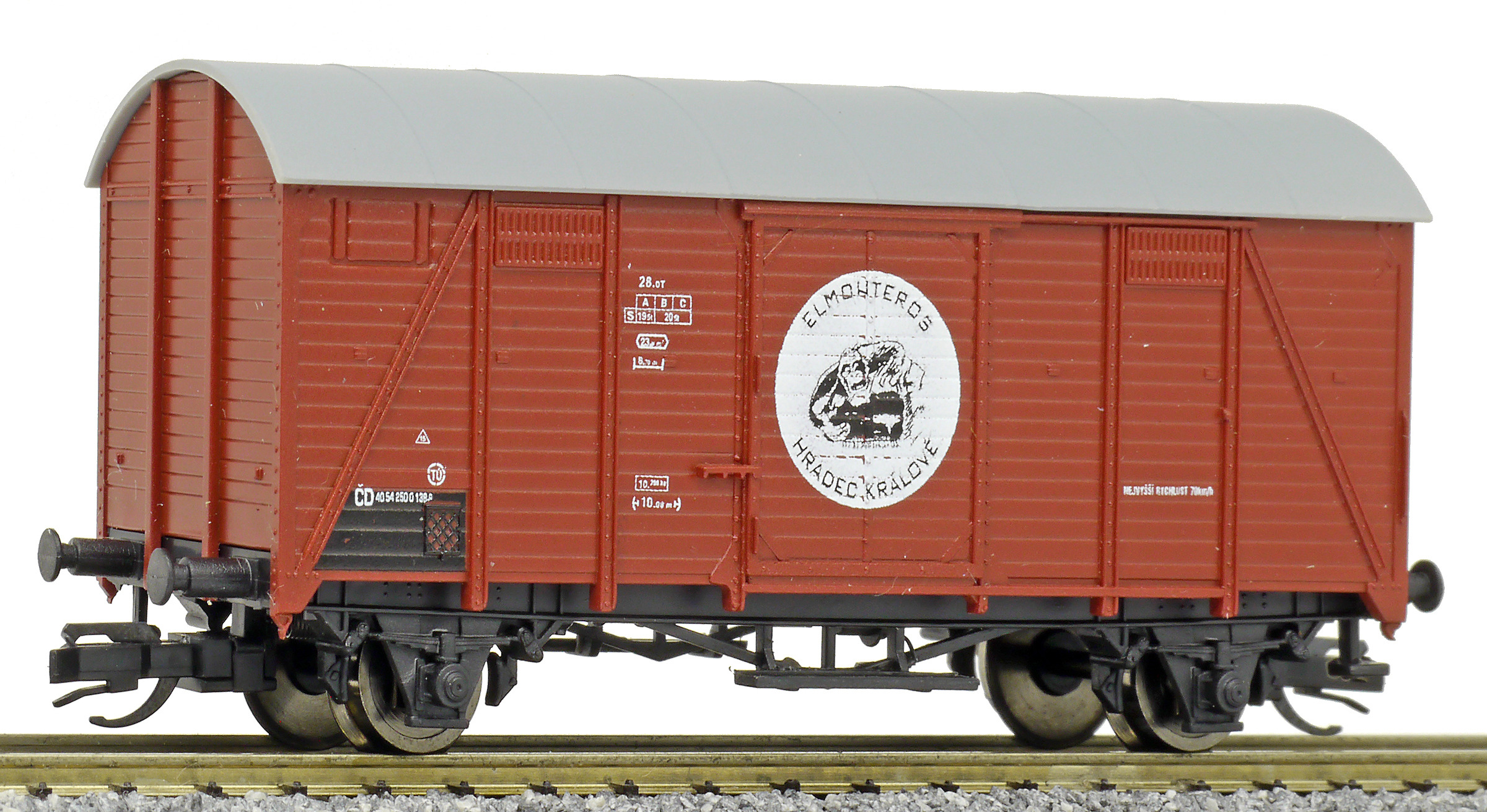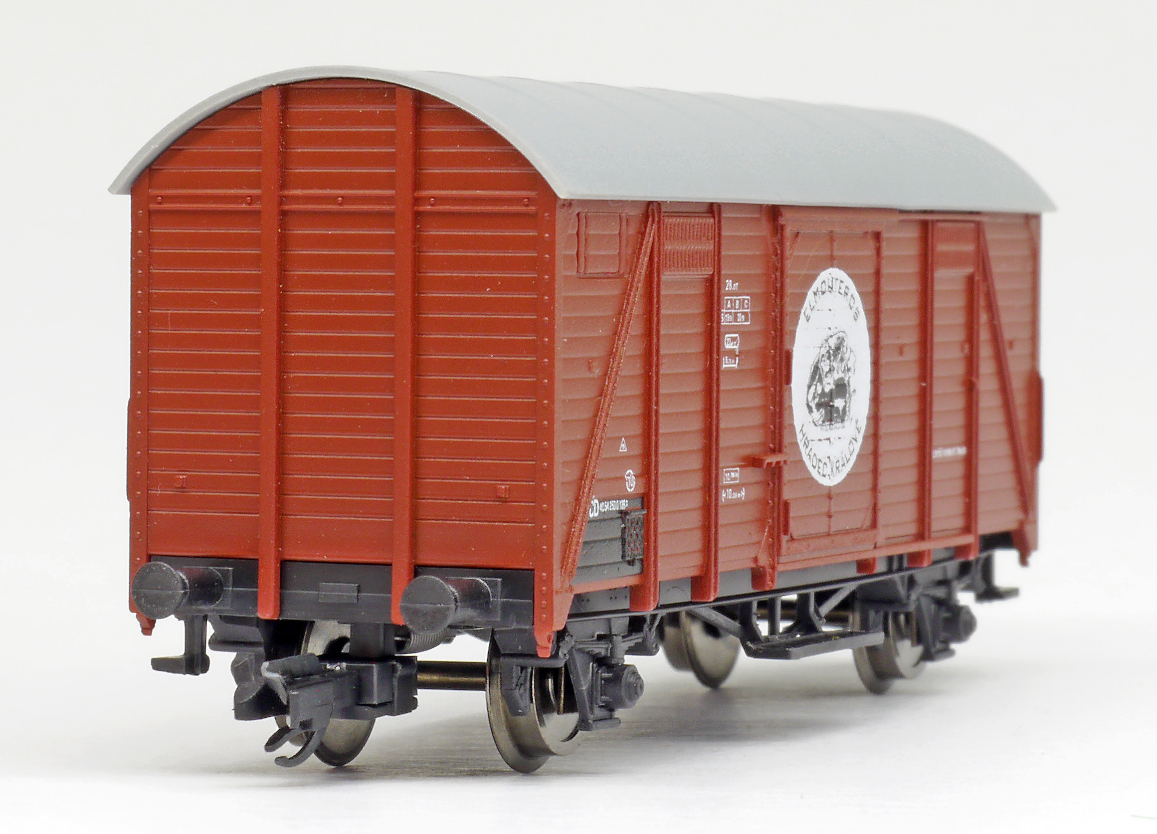 | krytý nákladní vůz červenohnědý s šedou střechou do pracovního vlaku „Elmonteros”, logo opice |