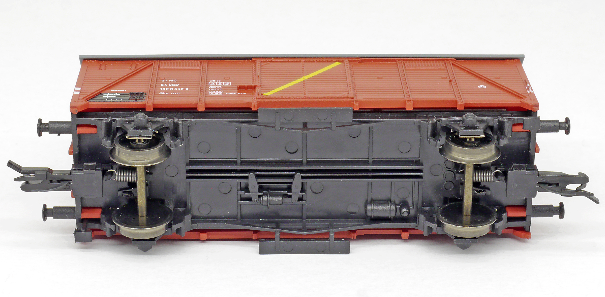 | • 21 54 102 8 442-0 | → | nákladní, nezávislé nápravy, pevný rozchod, ve vlastnictví železniční správy, RIV, PPV |