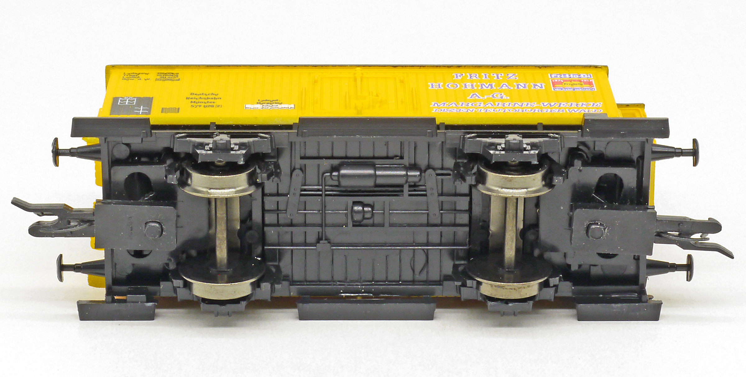 | krytý nákladní vůz žlutý s šedou střechou a brzdařskou budkou „Fritz Hohmann“ |