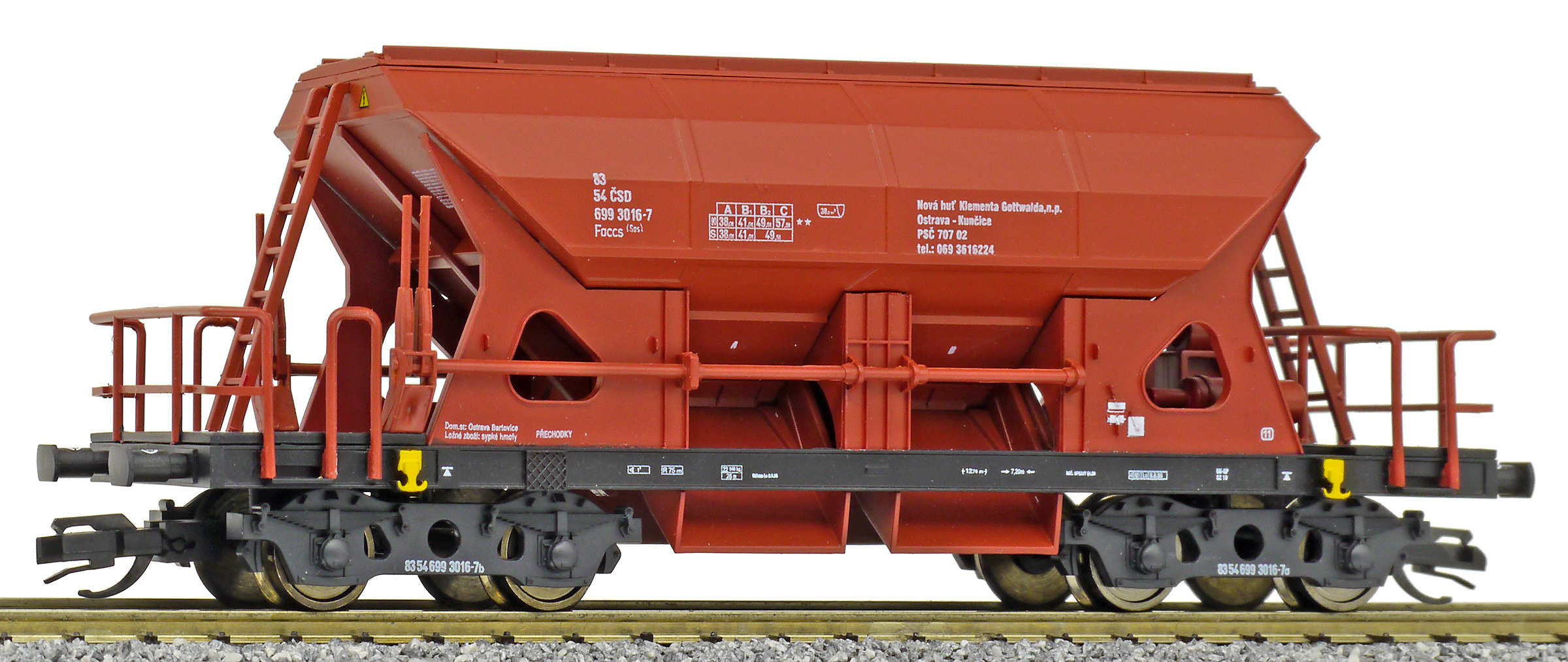 | nákladní samovýsypný vůz červenohnědý s černým rámem, s klapkami „NHKG Ostrava-Kunčice“ |