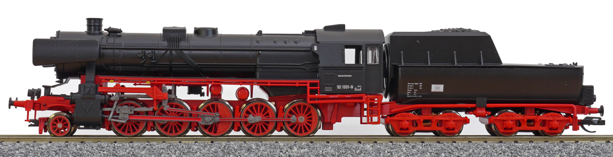 | set parní lokomotivy BR 52 a tří otevřených vysokostěnných vozů s nákladem uhlí |