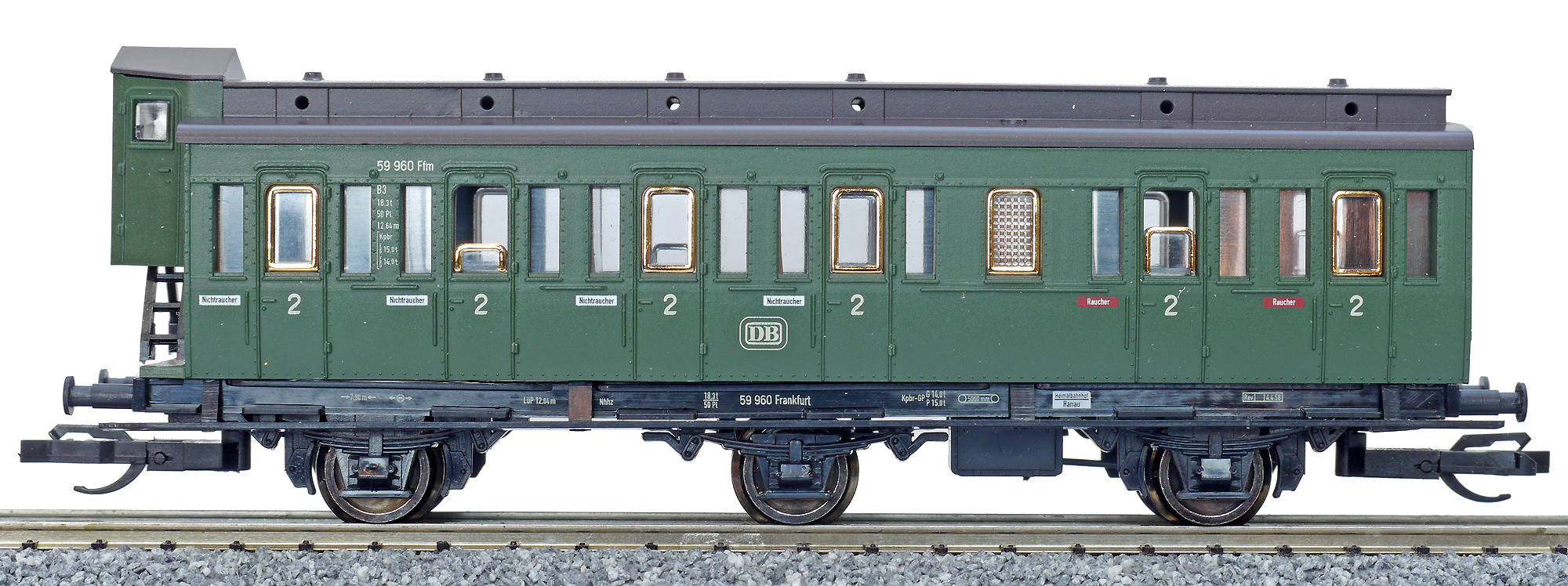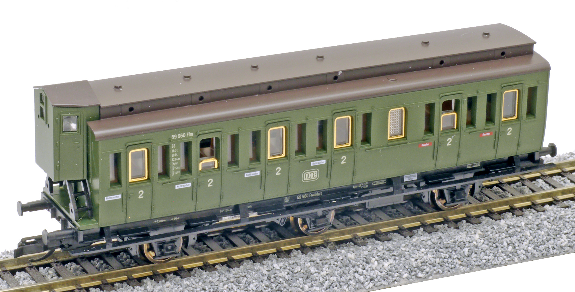 oddílový osobní vůz zelený s černou střechou a brzdařskou budkou 2. tř.