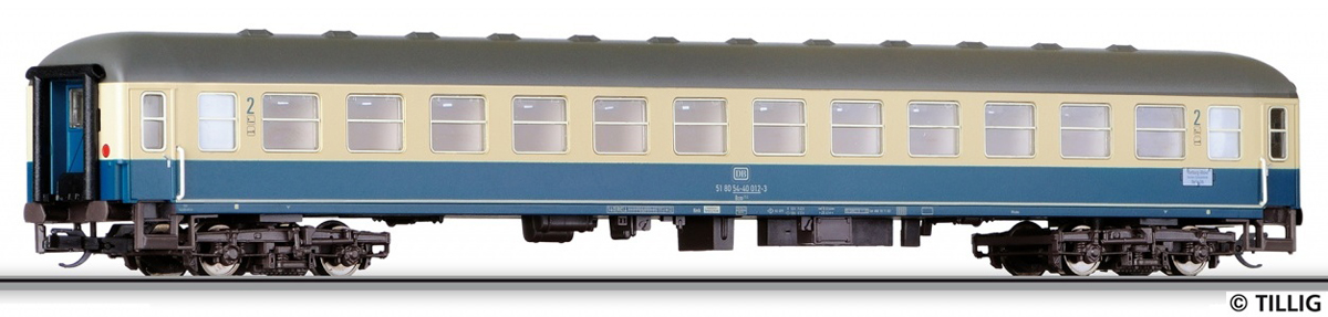 Popis   lehátkový vůz modrý-slonová kost s šedou střechou 2. tř.