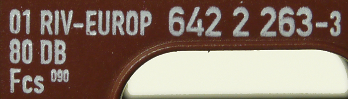 | • 01 80 642 2 263-3 | → | nákladní, nezávislé nápravy, pevný rozchod, ve vlastnictví železniční správy, RIV, EUROP/IF |