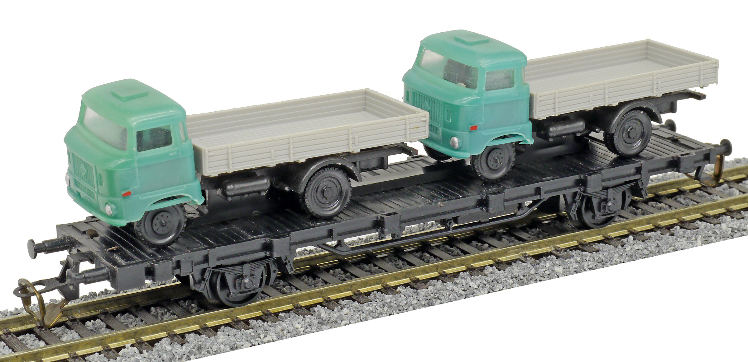 | plošinový vůz černý s nákladem dvou automobilů W50 |
