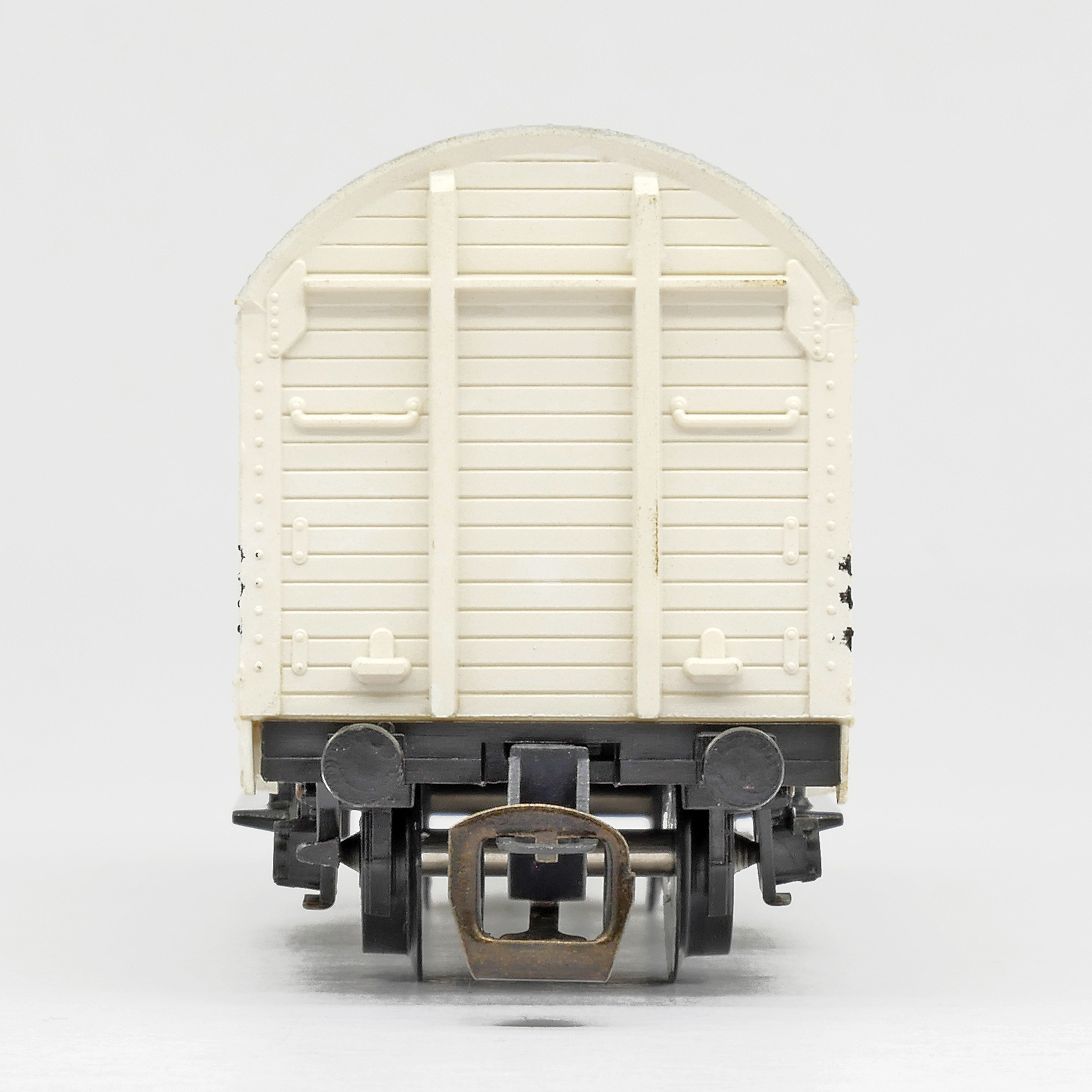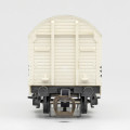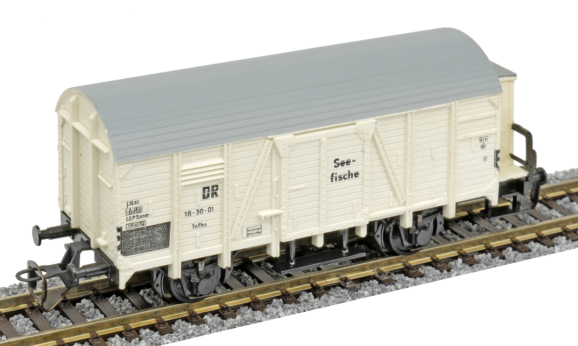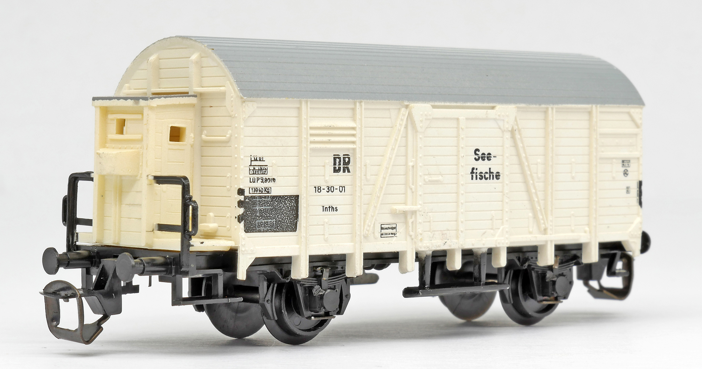 | nákladní chladící vůz bílý s šedou střechou a s brzdařskou budkou na přepravu ryb „Seefische“ |