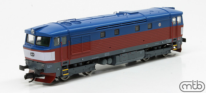 Popis   dieselová lokomotiva červená-modrá s bílým pásem, tmavě šedý rám a podvozky