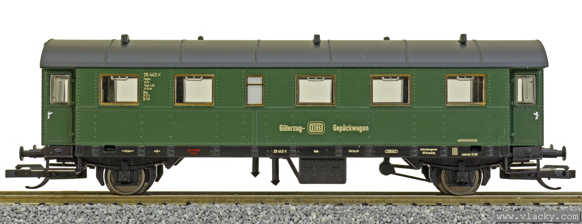 Popis   pomocný zavazadlový vůz do nákladního vlaku zelený s šedou střechou