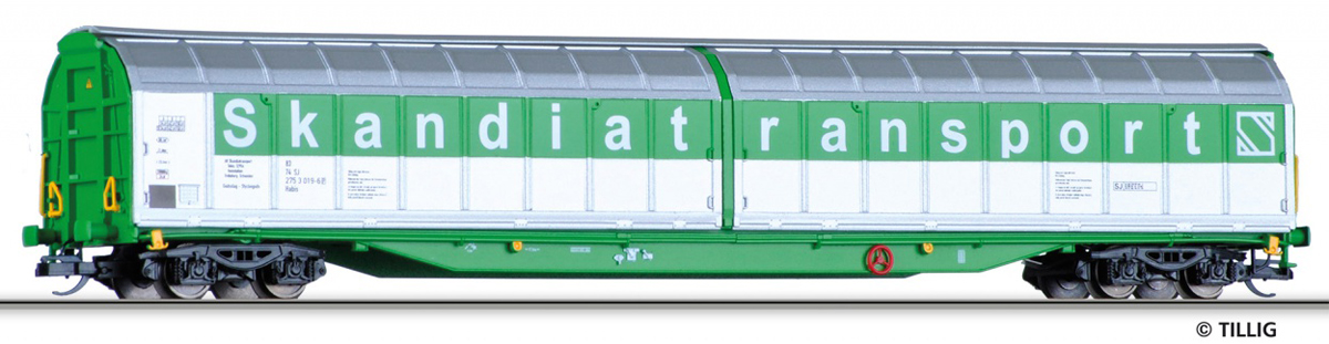 | krytý nákladní vůz hráškově zelený se stříbrnými bočnicemi „Skandiatransport“ |