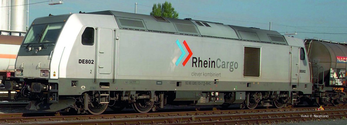 | dieselová lokomotiva stříbrná-šedá „RheinCargo GmbH“ |