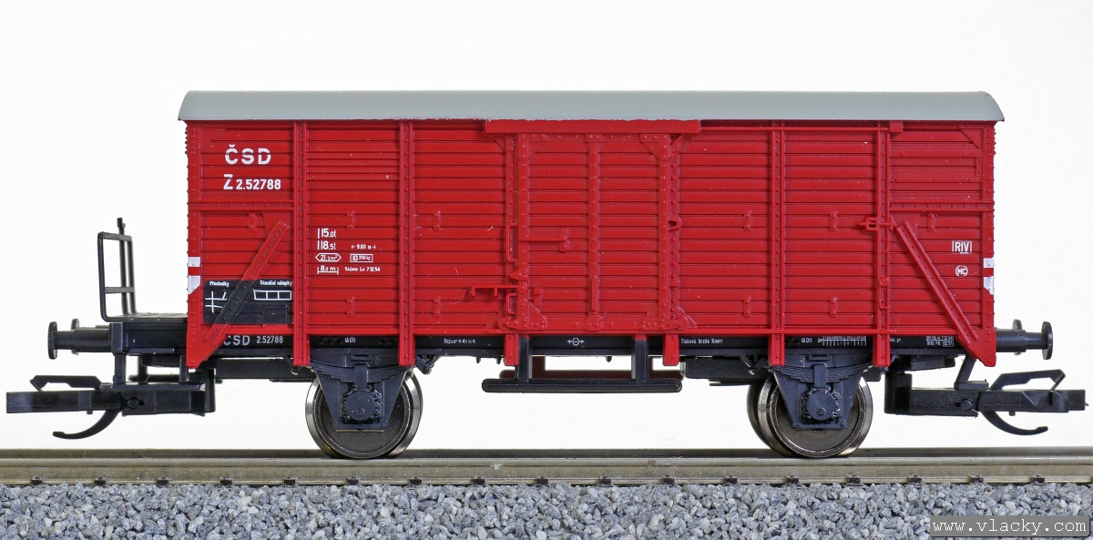 krytý nákladní vůz červenohnědý s šedou střechou a brzdařskou plošinou
