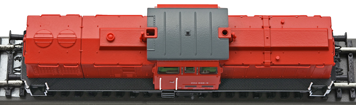 dieselová lokomotiva červená s černým rámem a pojezdem