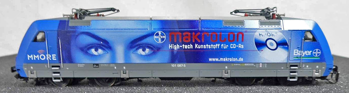 Popis   elektrická lokomotiva v modrém reklamním nátěru „Makrolon“