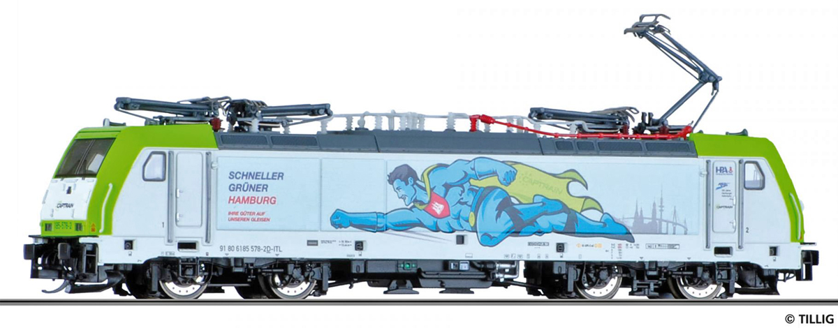 | elektrická lokomotiva stříbrná s reklamním potiskem „SCHNELLER GRÜNER HAMBURG“ |