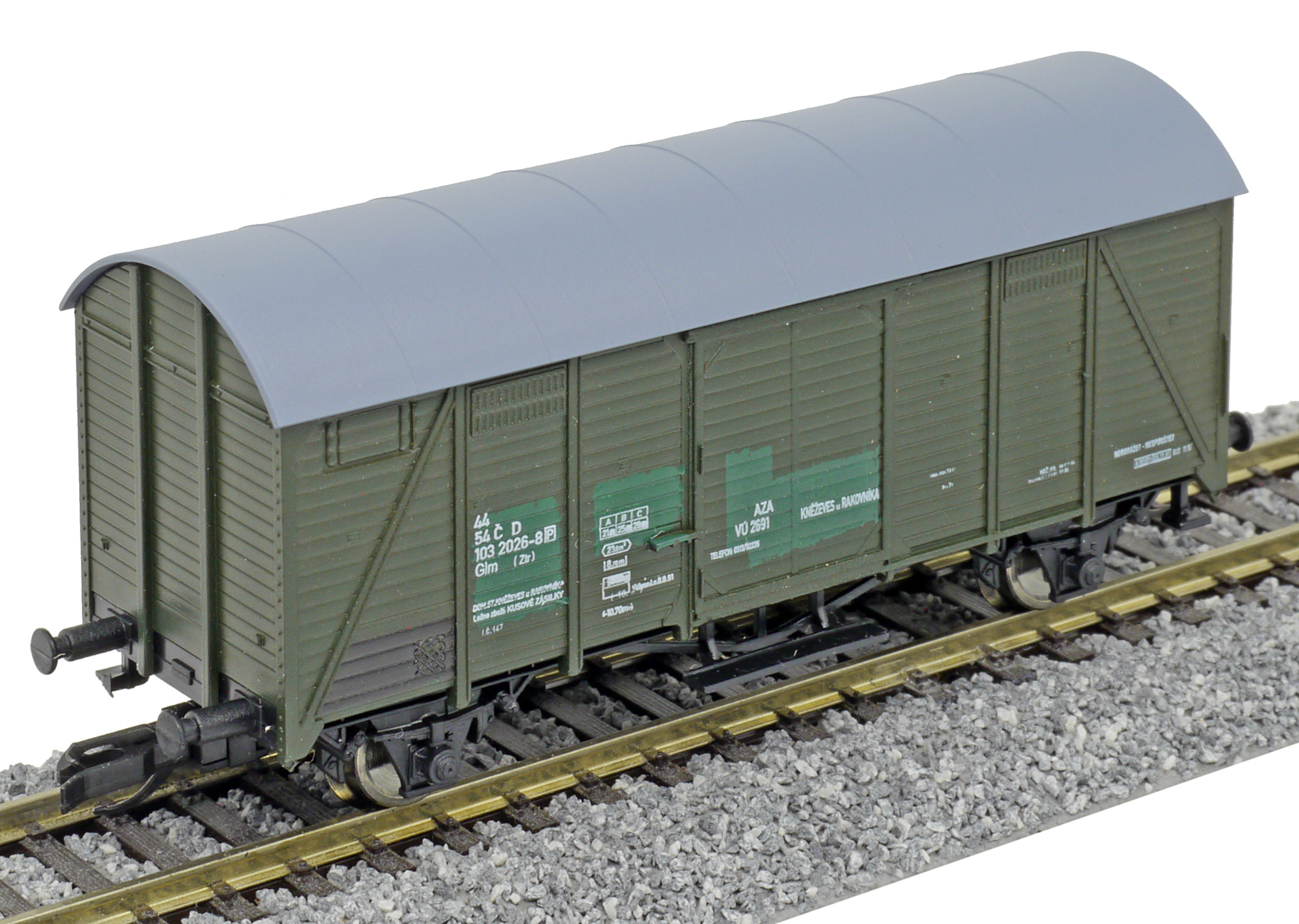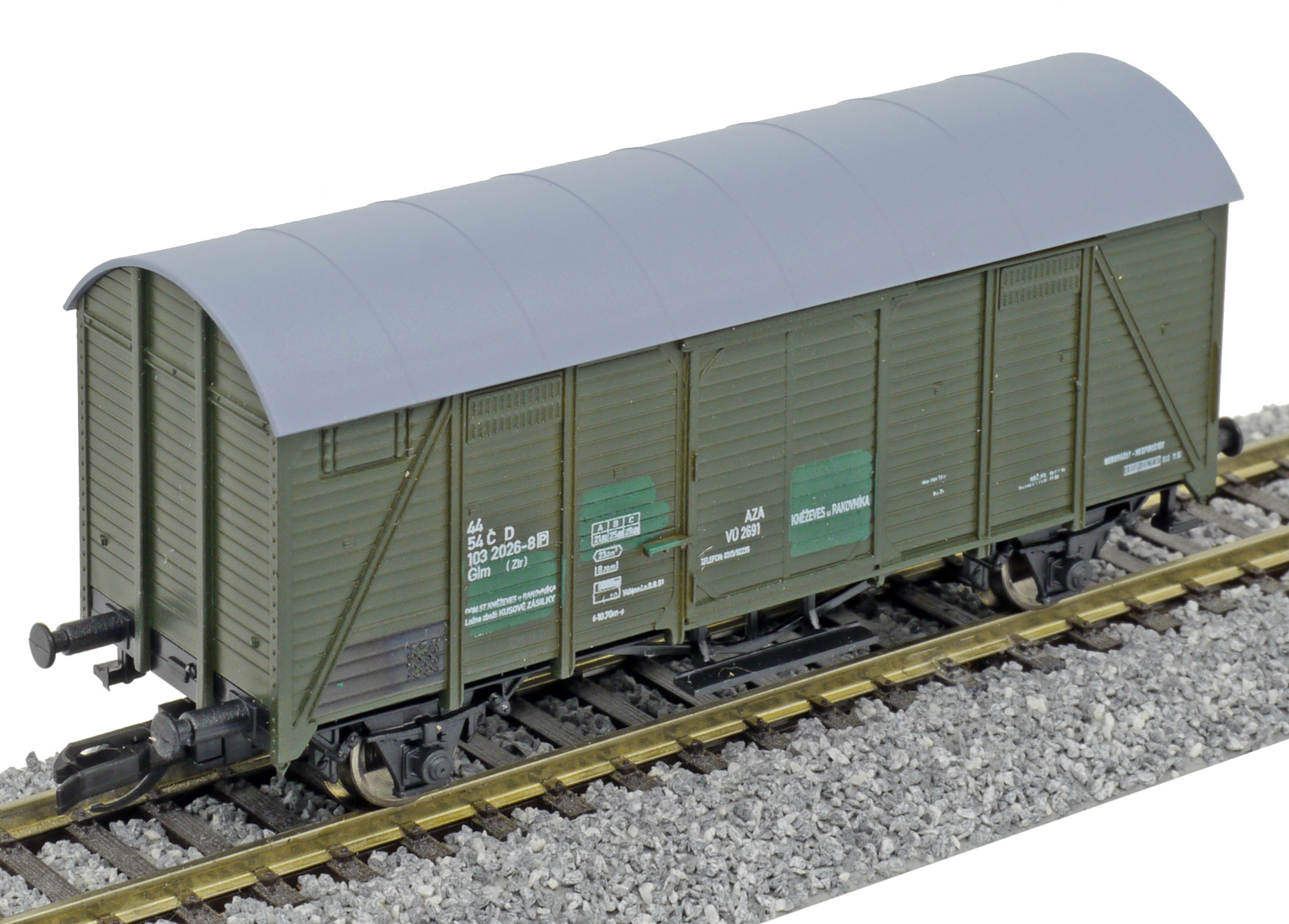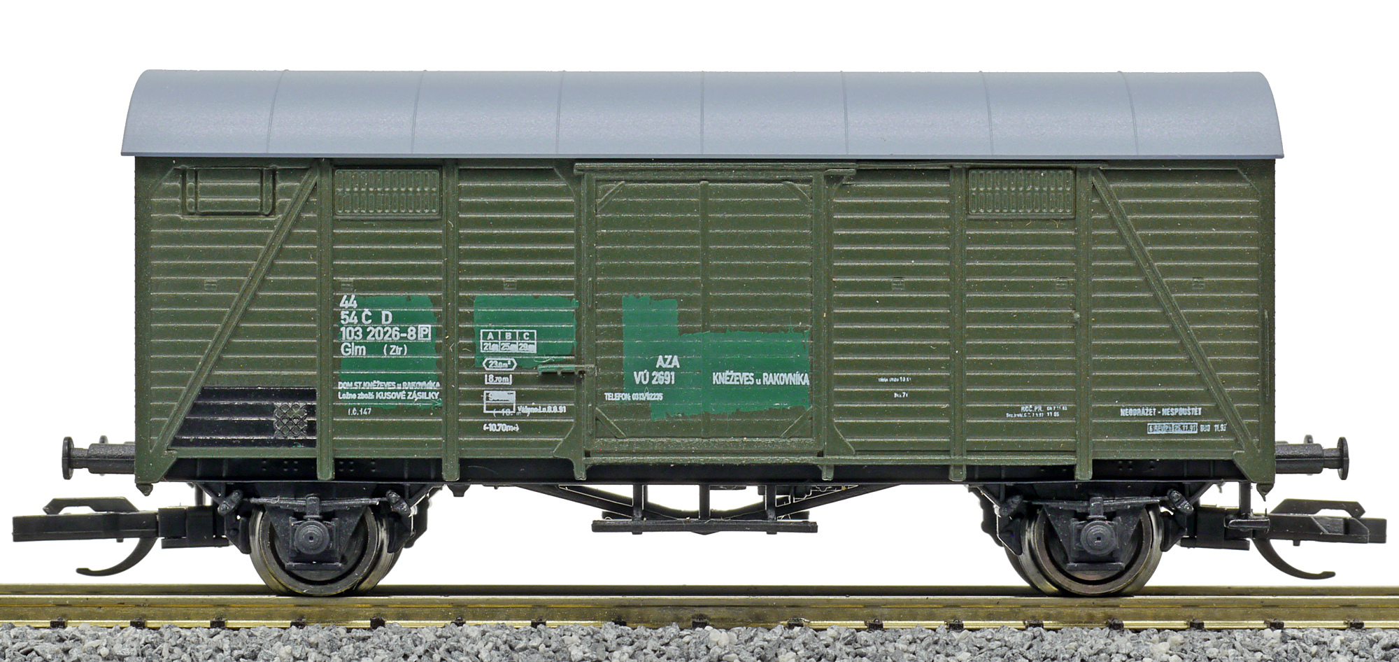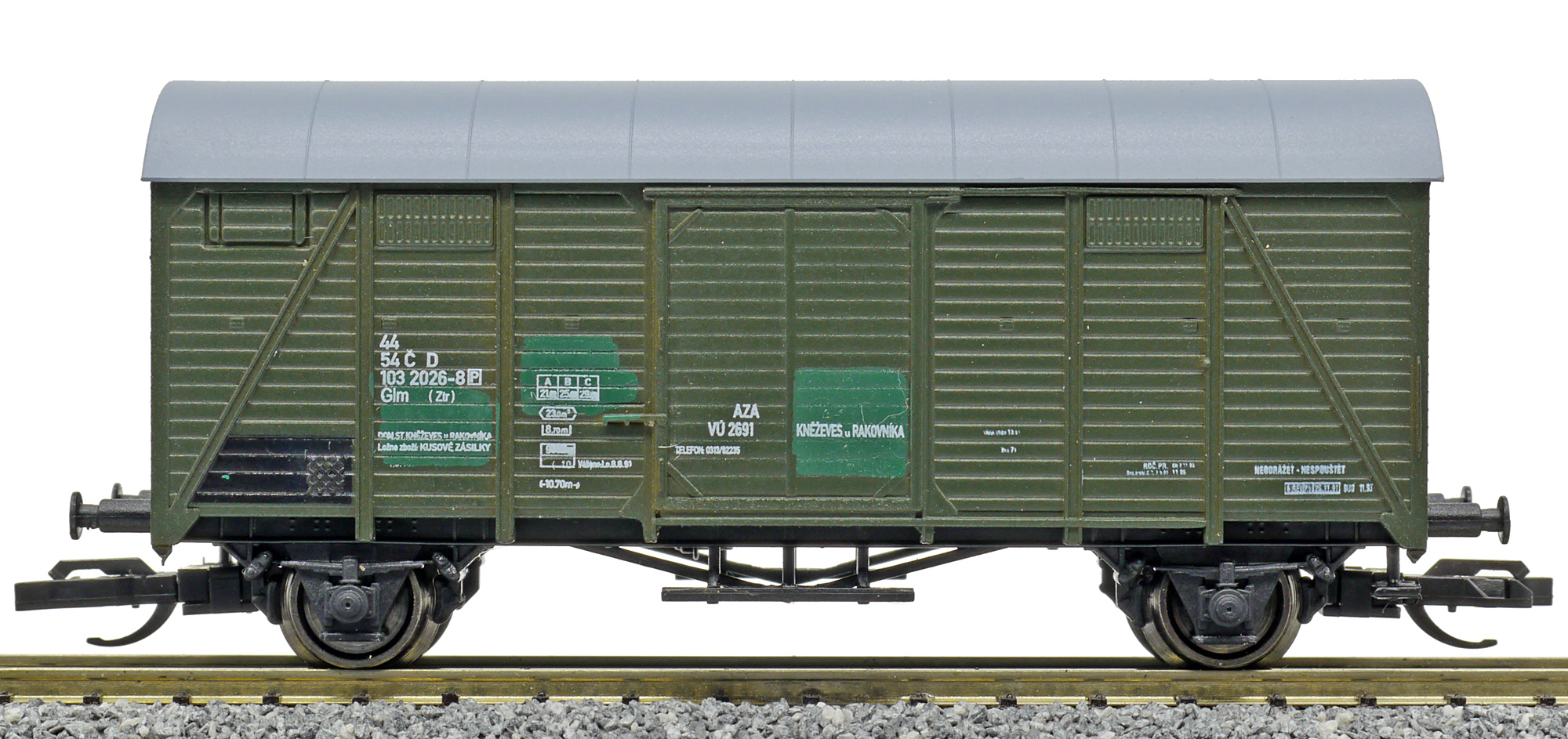 | krytý nákladní vůz zelený s šedou střechou „AZA Kněževes u Rakovníka“ |