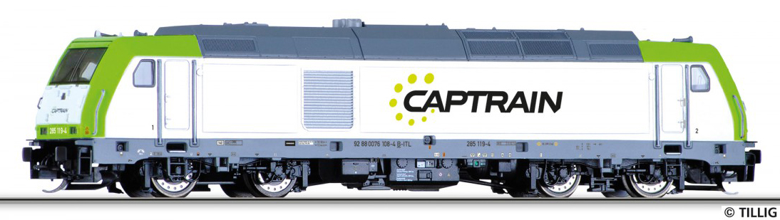 | dieselová lokomotiva bílá-zelená, šedá střecha, rám a pojezd „CAPTRAIN“ |