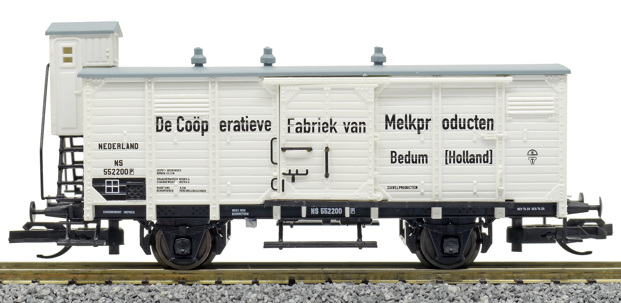 | tepelně izolovaný vůz bílý s šedou střechou „Cooperatieve Fabriek van Melkproducten“ |