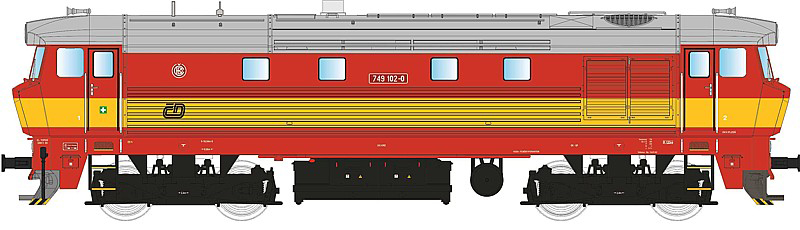 | dieselová lokomotiva červená s výstražným pruhem, šedá střecha, DKV Plzeň |