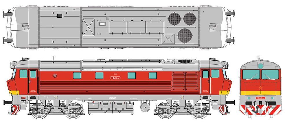 | dieselová lokomotiva červená s výstražným žlutým proužkem, šedá střecha |