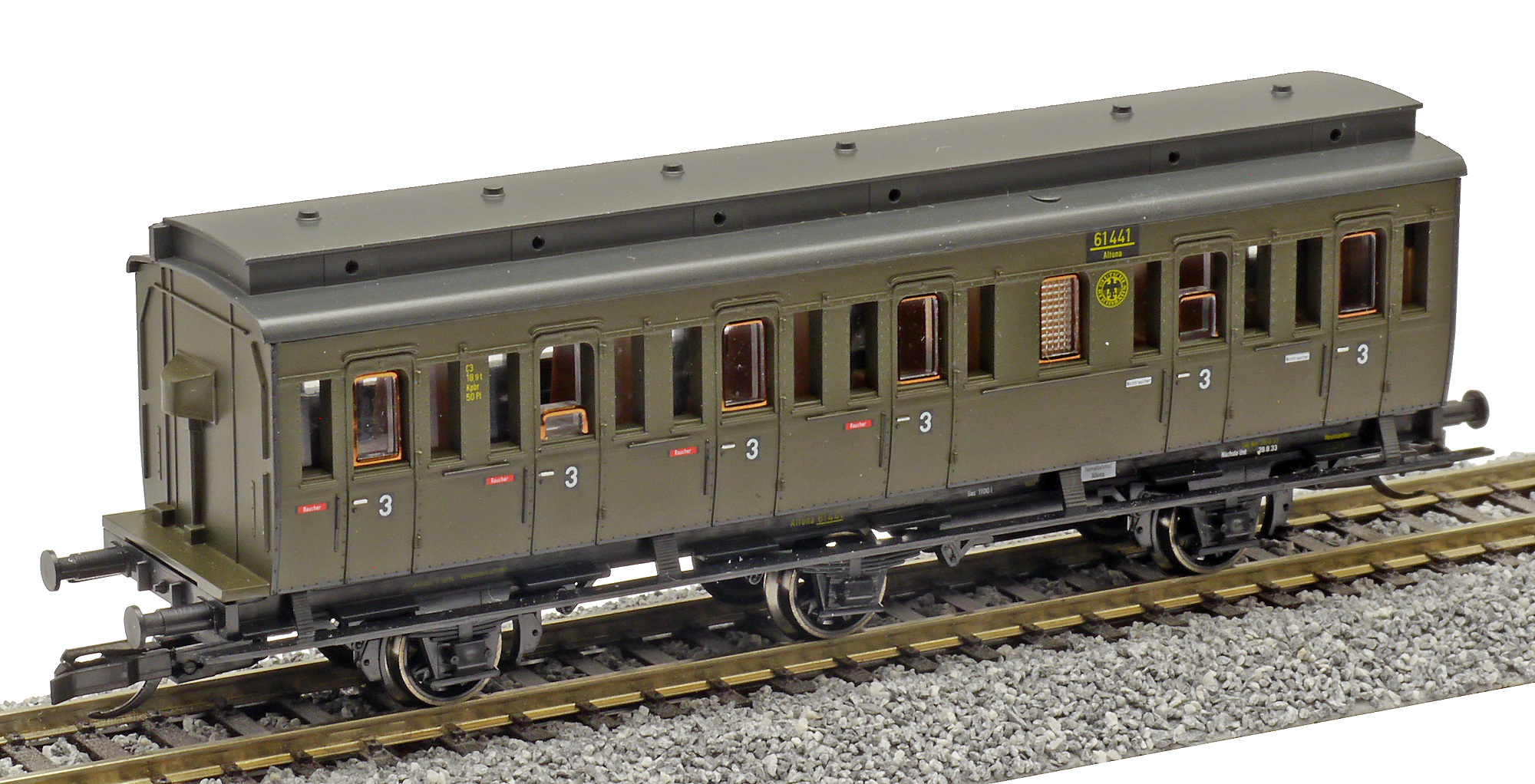 | oddílový osobní vůz tmavě zelený s černou střechou 3. tř. |