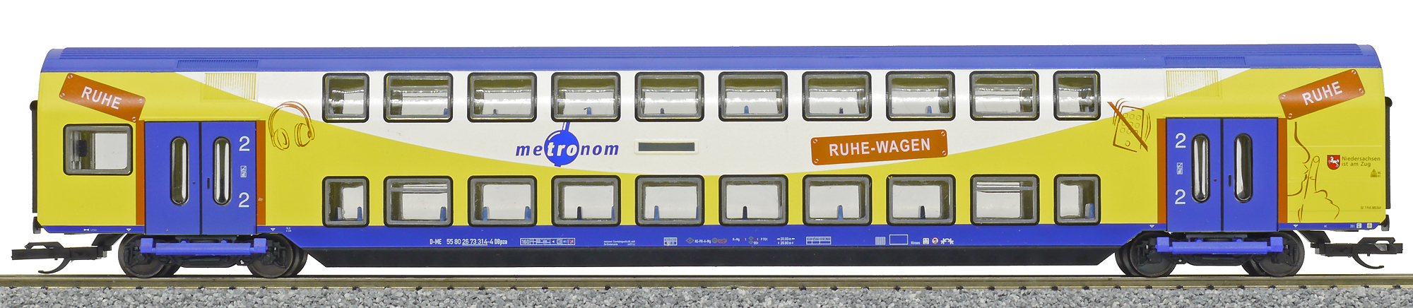 | osobní patrový „tichý“ vůz v barevném schematu „metronom“ 2. tř |