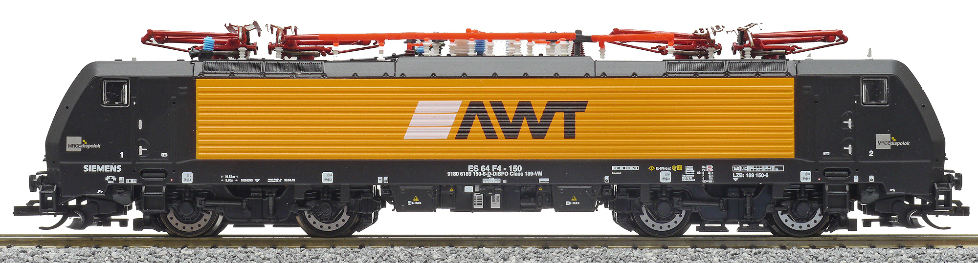 | elektrická lokomotiva černá-oranžová s logem „AWT“ |
