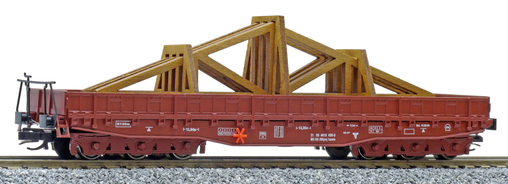 | nízkostěnný nákladní vůz červehonědý s nákladem krovů |