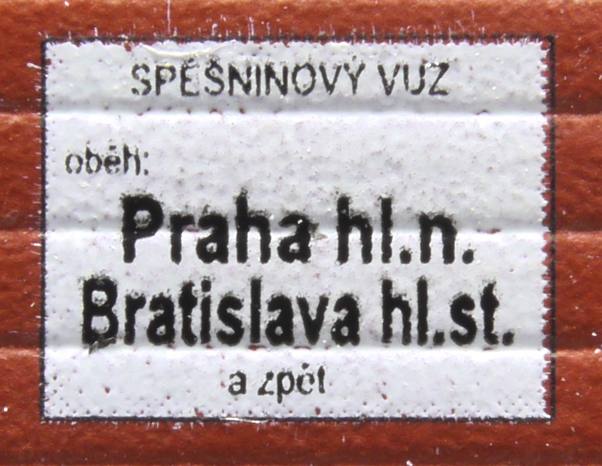 | krytý nákladní spěšninový vůz červenohnědý „Praha hl.n. - Bratislava hl.st.“ |