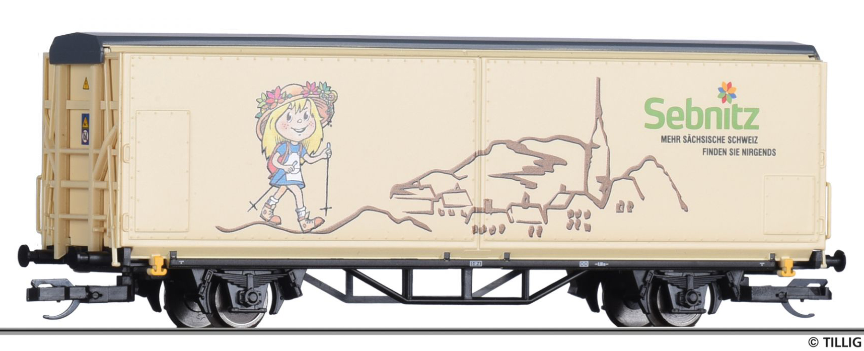 | krytý nákladní vůz s posuvnými bočnicemi a s reklamním potiskem „TILLIG/Sebnitz“ |