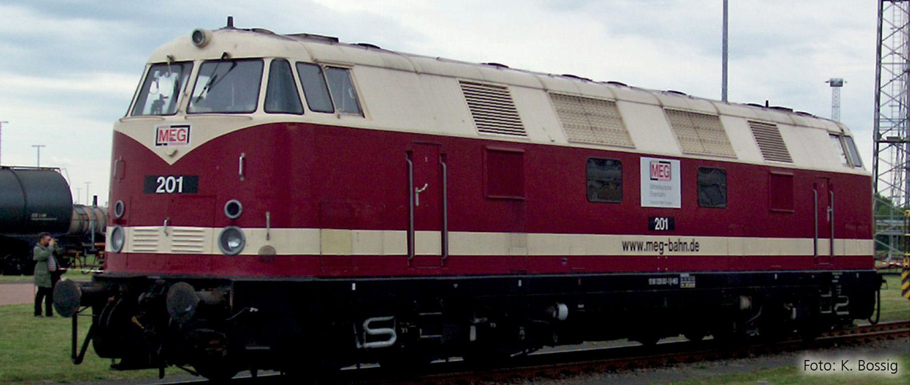 Popis   dieselová lokomotiva červená-slonová kost Mitteldeutschen Eisenbahn GmbH (MEG)