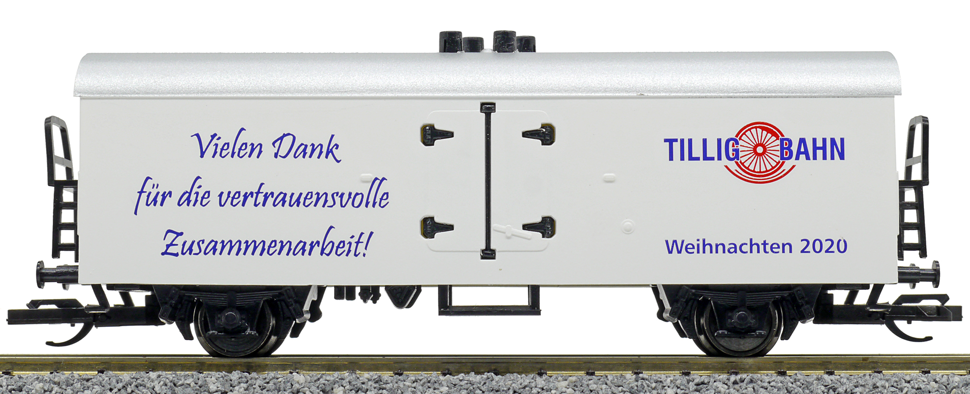 | chladící vůz bílý s šedou střechou a s reklamním potiskem „Weinachten 2020“ |