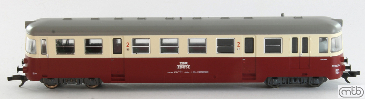 Popis   motorový vůz červený-slonová kost s šedou střechou, výstražný pruh na čelech