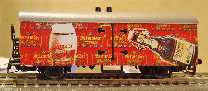Popis   nákladní chladící vůz červený se stříbrnou střechou s potiskem „Detmolder Landbier“