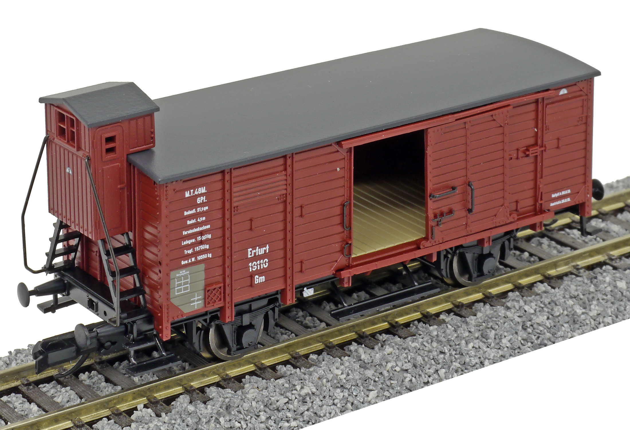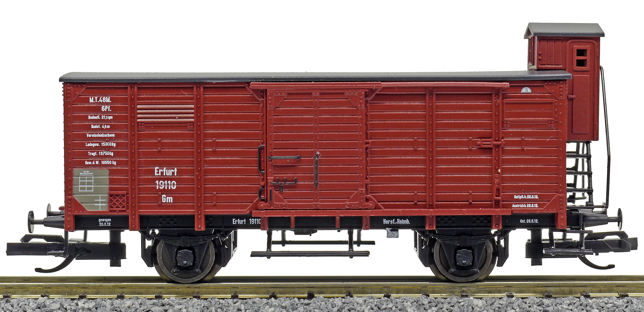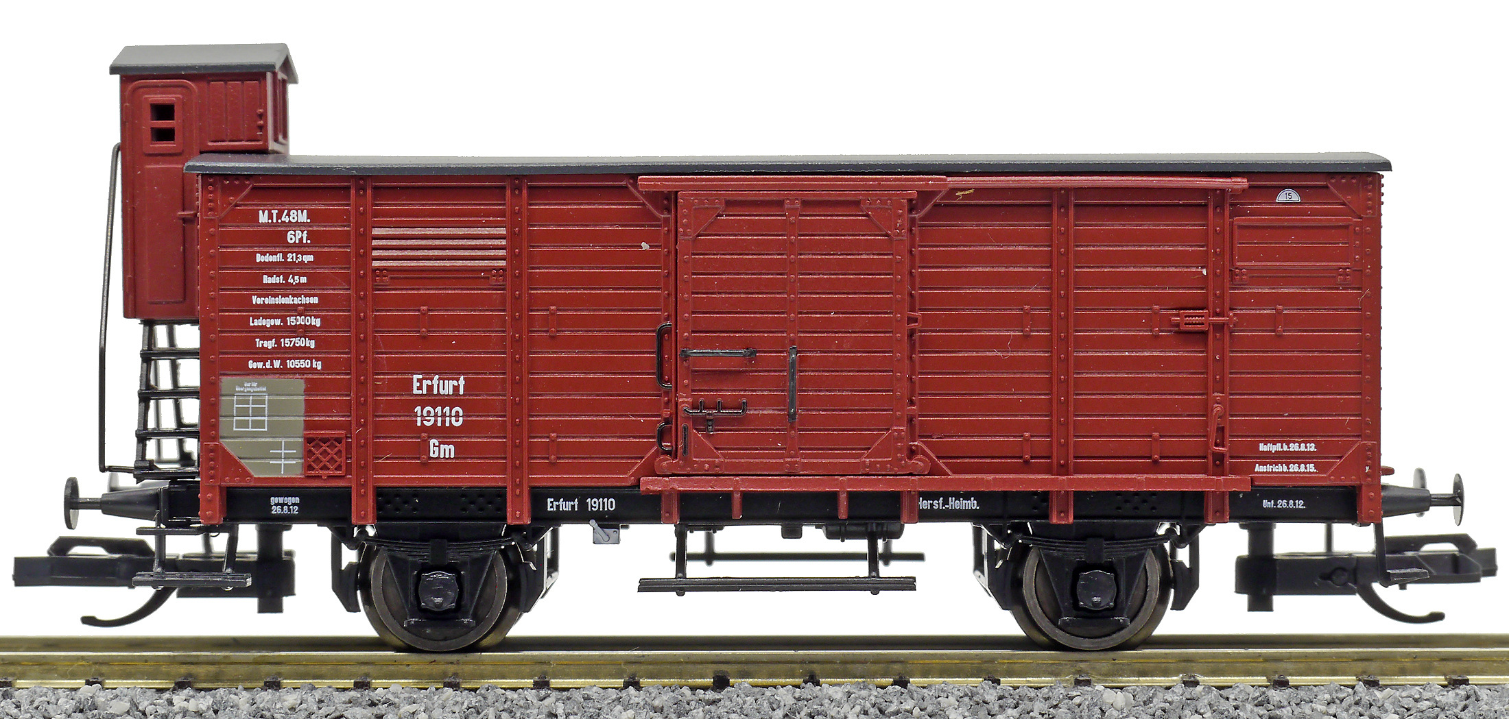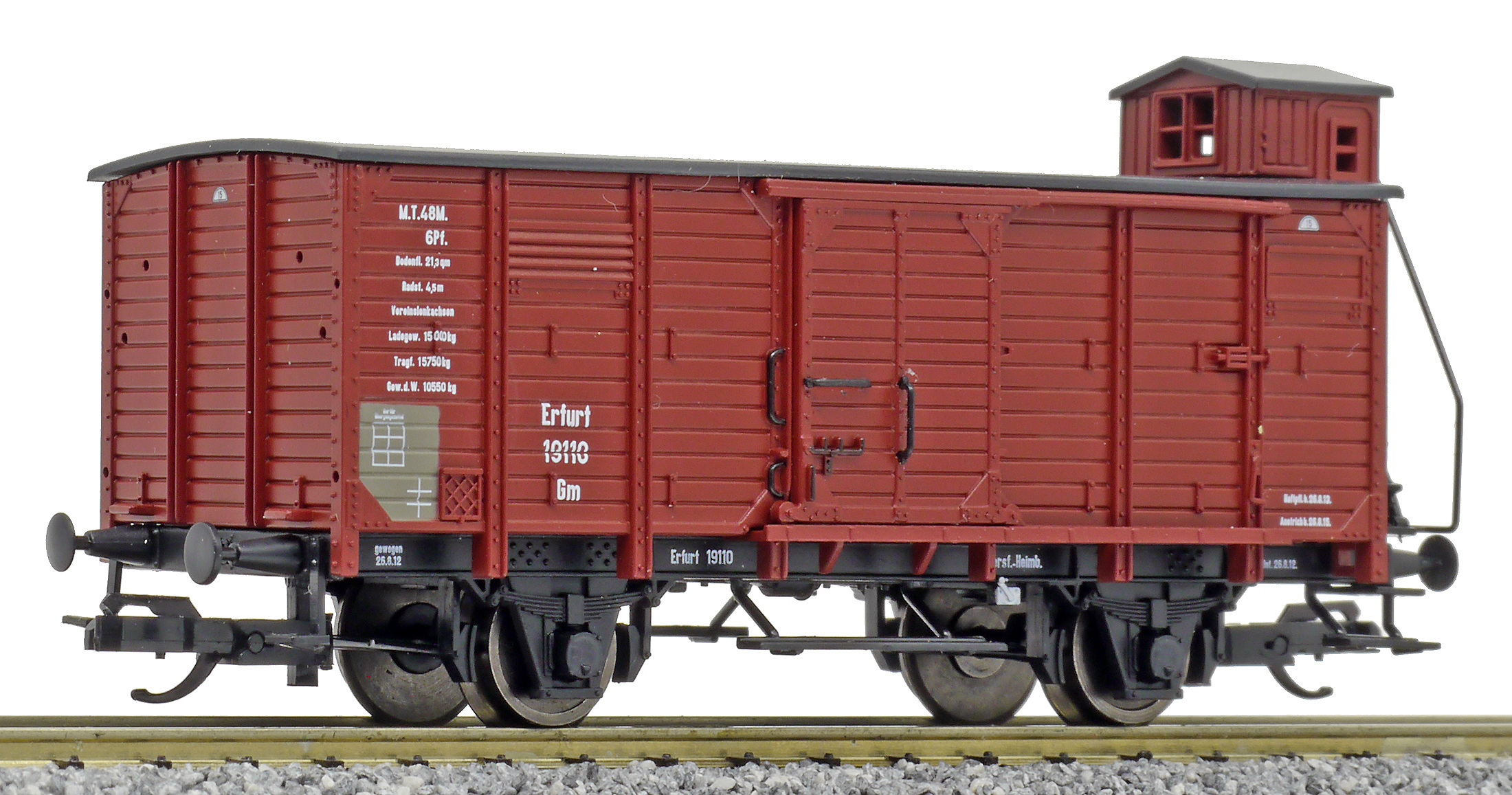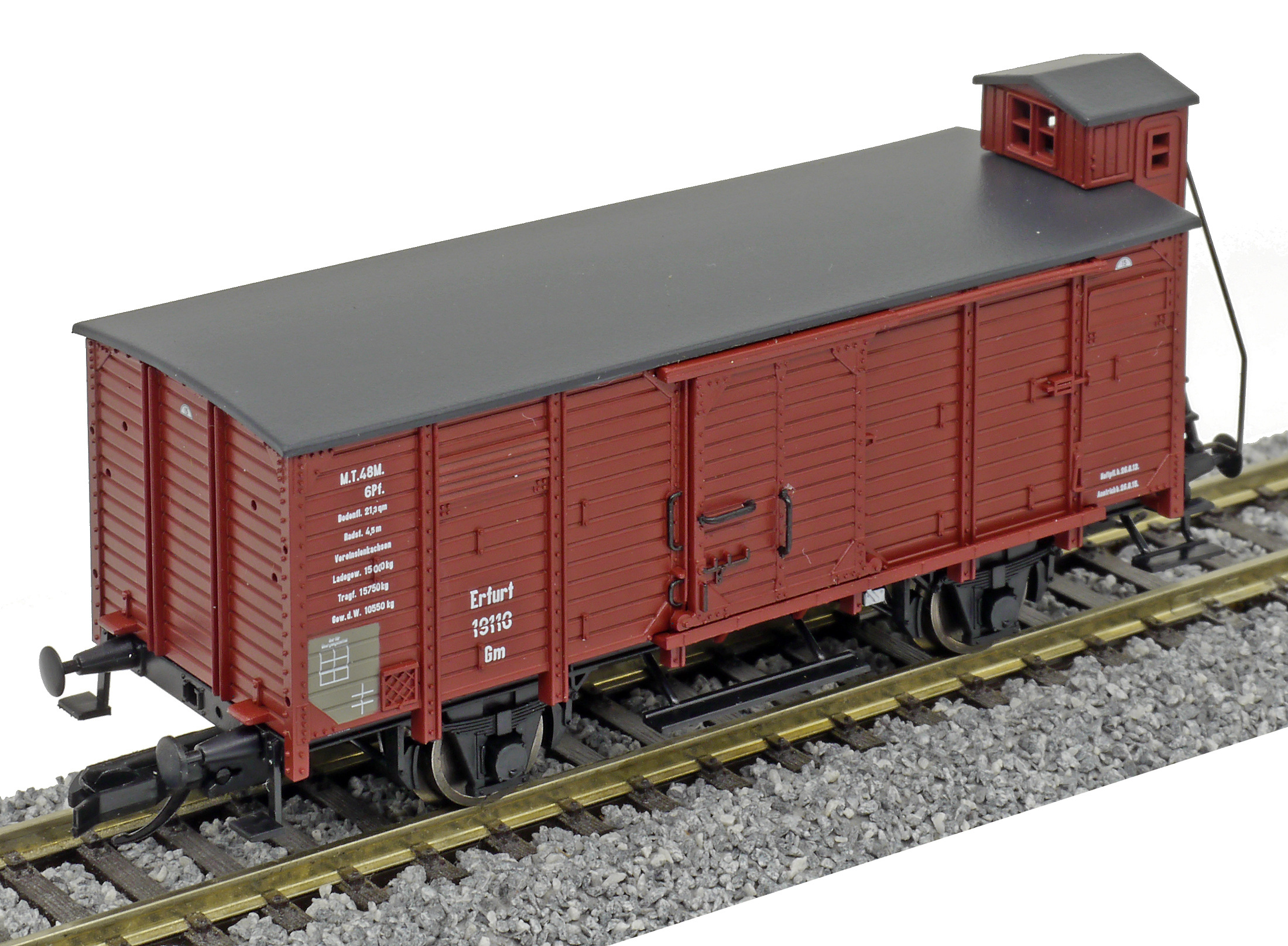 krytý nákladní vůz červenohnědý s černou střechou a s brzdařskou budkou