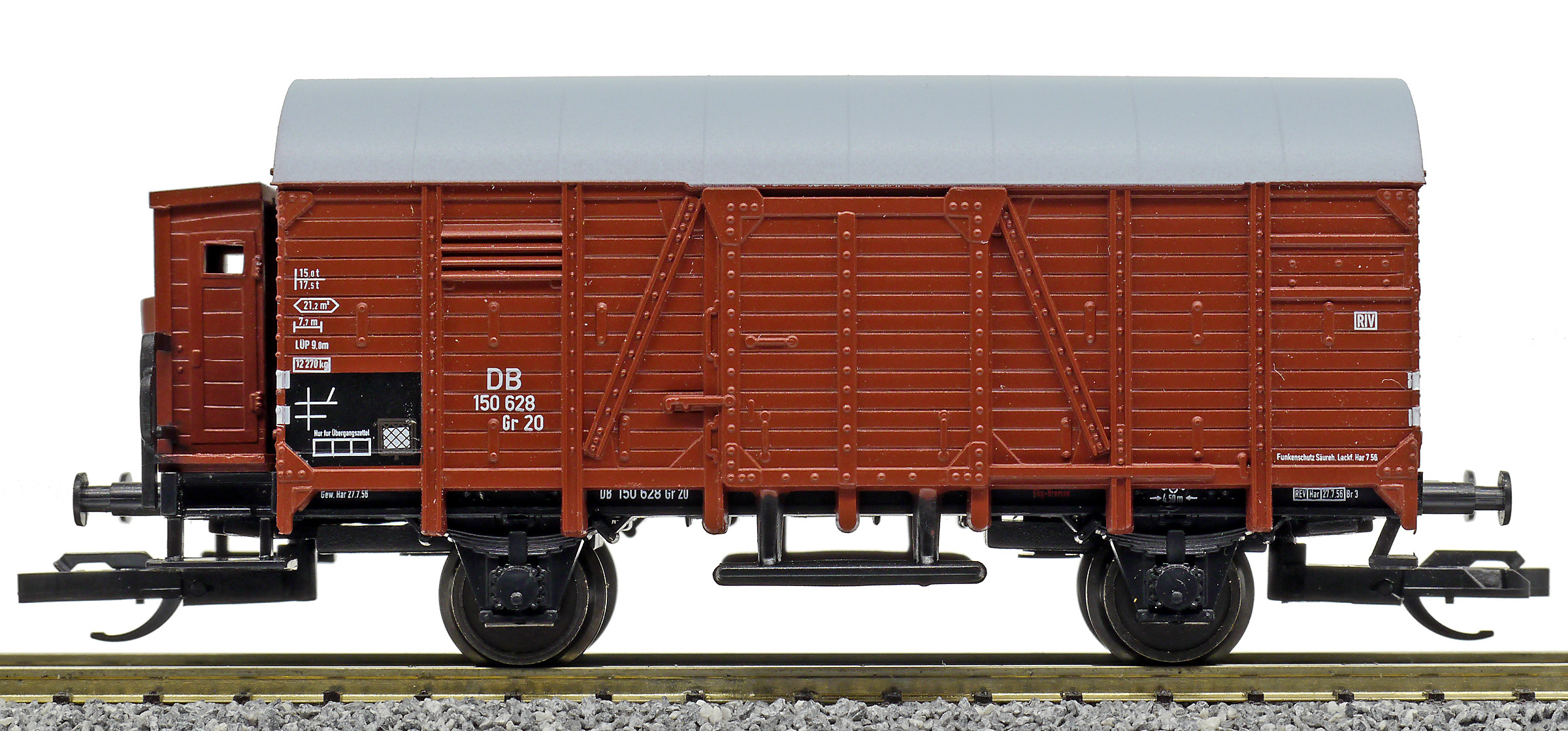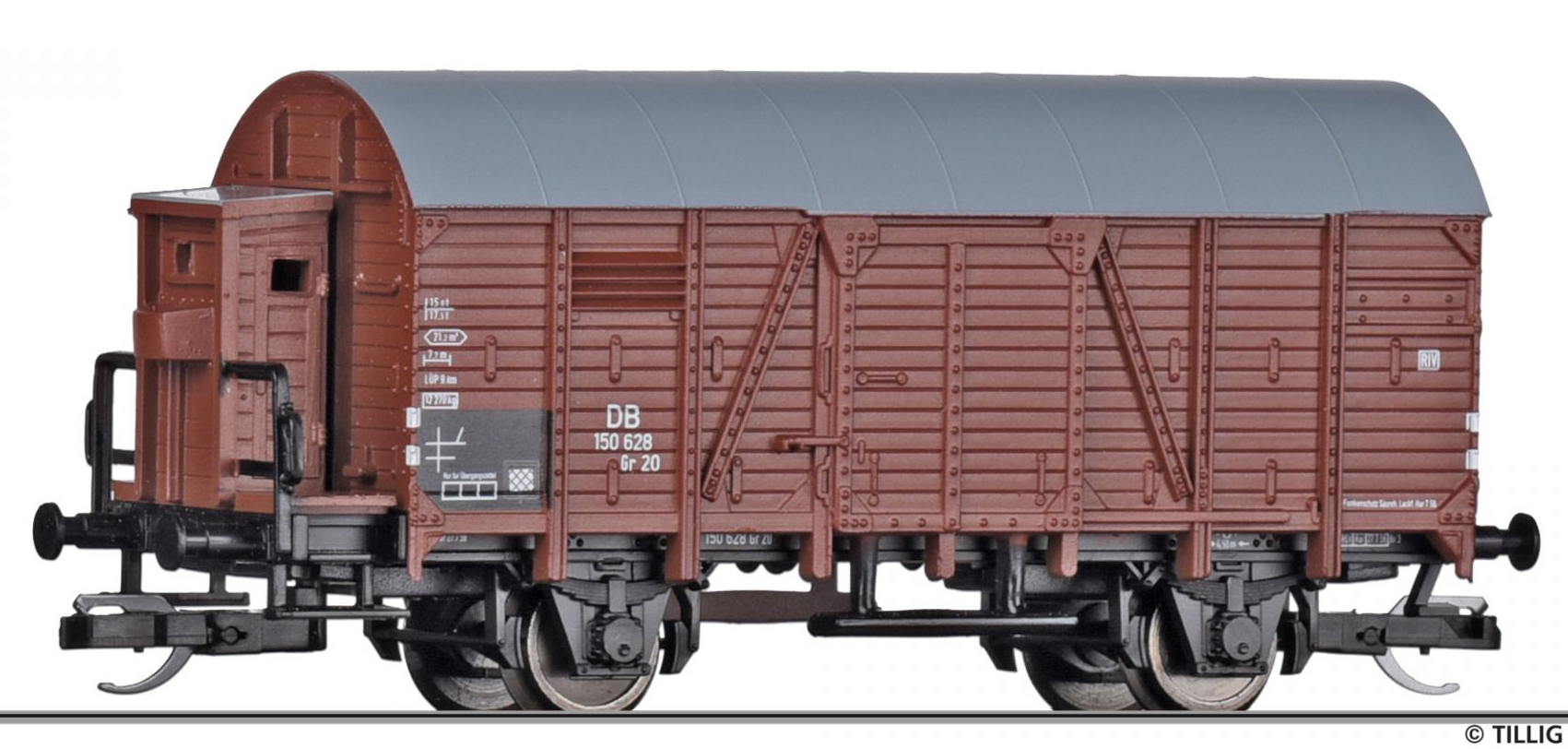 | krytý nákladní vůz červenohnědý s šedou střechou a s brzdařskou budkou |