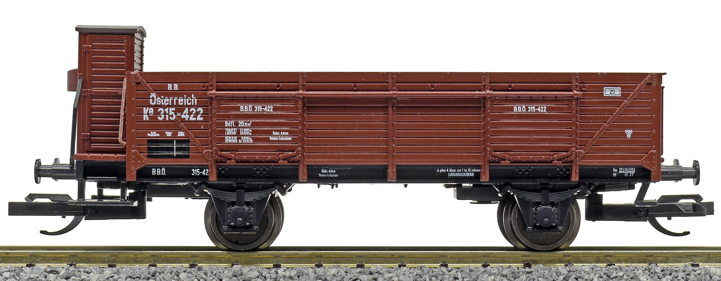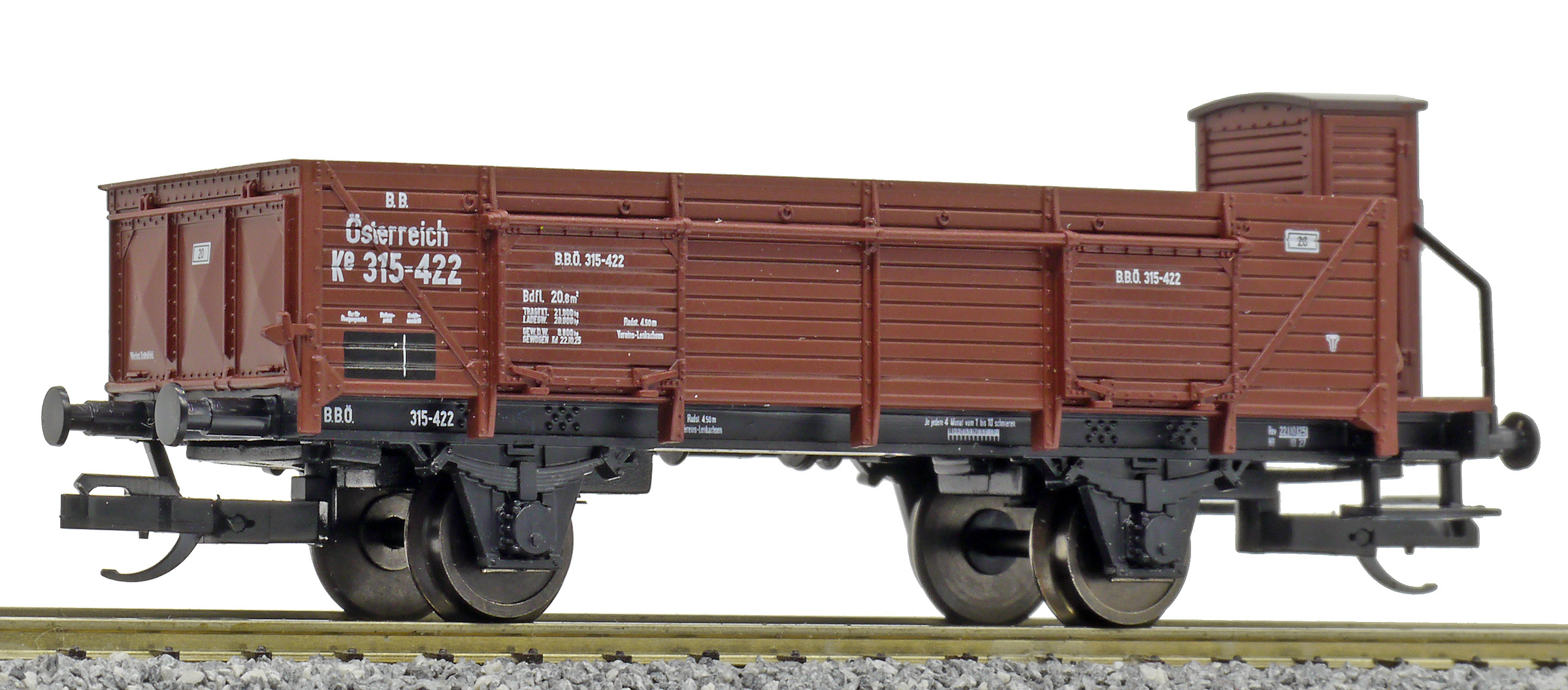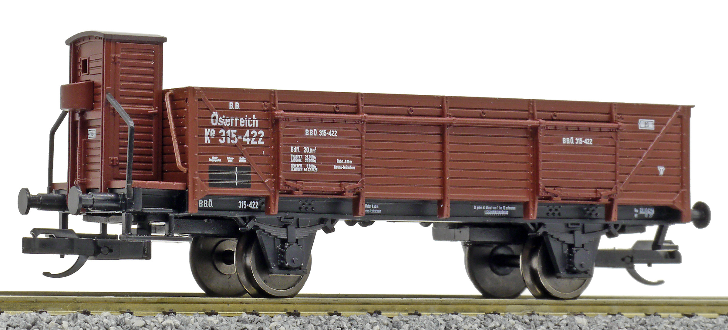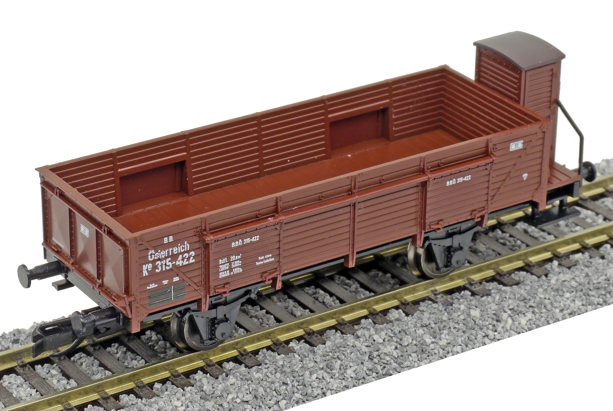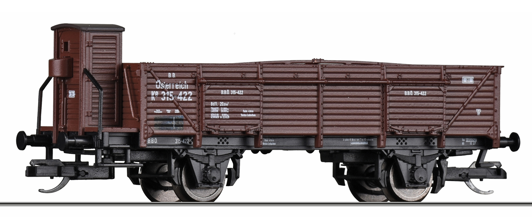 otevřený nákladní vůz hnědý s brzdařskou budkou